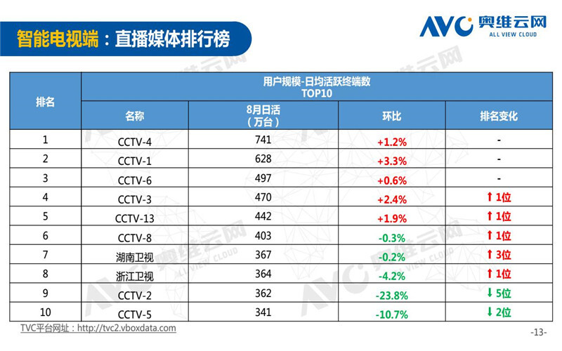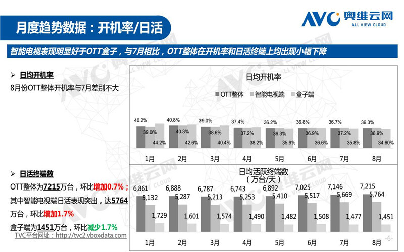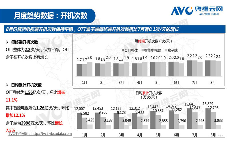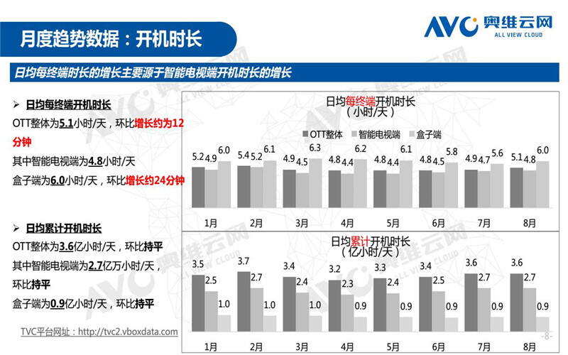 8月份智能电视端开机次数保持平稳,OTT盒子端每终端开机次数相比7月有0.1次/天的增加,以下是PPT内容: