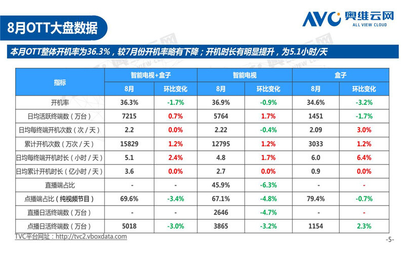 【流媒体网】摘要:8月OTT整体开机率为36.3%,较7月份开机率略有下降;开机时长有明显提升,为5.1小时/天。
