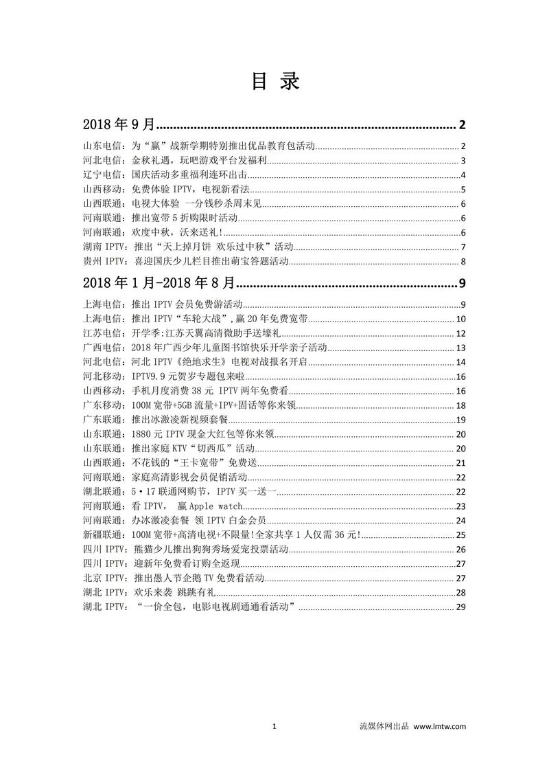 【流媒体网】消息:本报告为流媒体网对2018年1-9月各省IPTV市场活动的汇总,供业界参考。文章后附有报告原文链接,如有需要,请读者朋友自行下载。