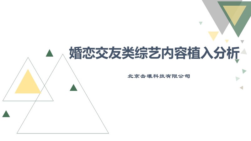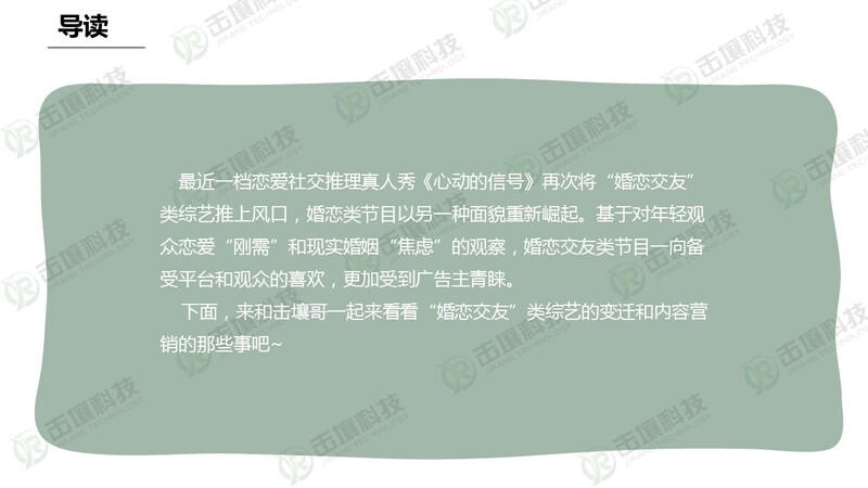 【流媒体网】摘要:击壤洞察发布《婚恋交友类综艺内容植入分析》,以下是PPT全文: