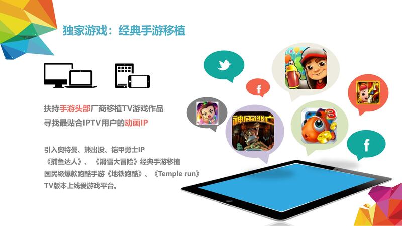 10月25-26日,以“运营未来,视在必行”为主题的流媒体网第16届电视新媒体高峰论坛在杭州西溪举行,在25日下午的“电视大屏的精耕细作”分论坛上,炫彩互动网络科技有限公司家庭业务事业部总监王衠进行了主题为《爱游戏的大屏“闯关”之路》的演讲。以下是演讲的PPT: