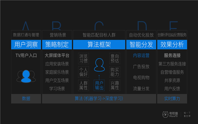 10月25-26日,以“运营未来,视在必行”为主题的流媒体网第16届电视新媒体高峰论坛在杭州西溪举行,在26日下午的“数据驱动大屏智能营销”分论坛上,电视猫创始人兼CEO马凯进行了主题为《大数据AI驱动大屏智能营销新趋势》的演讲。自2012年创立,电视猫已经成为中国最大的互联网电视内容聚合平台之一,目前已拥有1.1亿家庭用户。电视猫MoreTV建立了完善的大数据平台体系,并自主开发了人工智能算法,来驱动产品体验和挖掘用户价值。以下是演讲PPT内容: