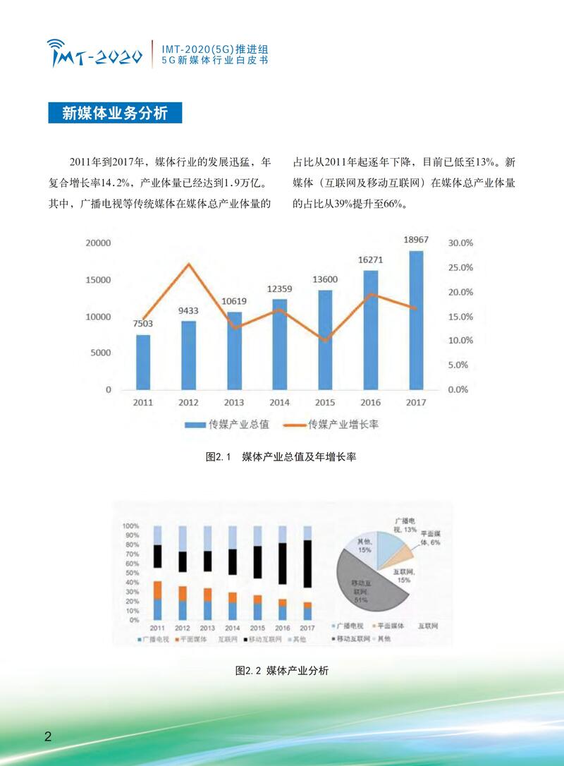 【流媒体网】摘要:2011年到2017年,媒体行业的发展迅猛,年复合增长率14.2%,产业体量已经达到1.9万亿。其中,广播电视等传统媒体在媒体总产业体量的占比从2011年起逐年下降,目前已低至13%。新媒体(互联网及移动互联网)在媒体总产业体量的占比从39%提升至66%。本白皮书将给出新媒体的业务分析、新媒体行业的通信需求、基于5G技术的新媒体行业解决方案和应用案例,并对基于5G技术的新媒体行业未来发展进行了展望。