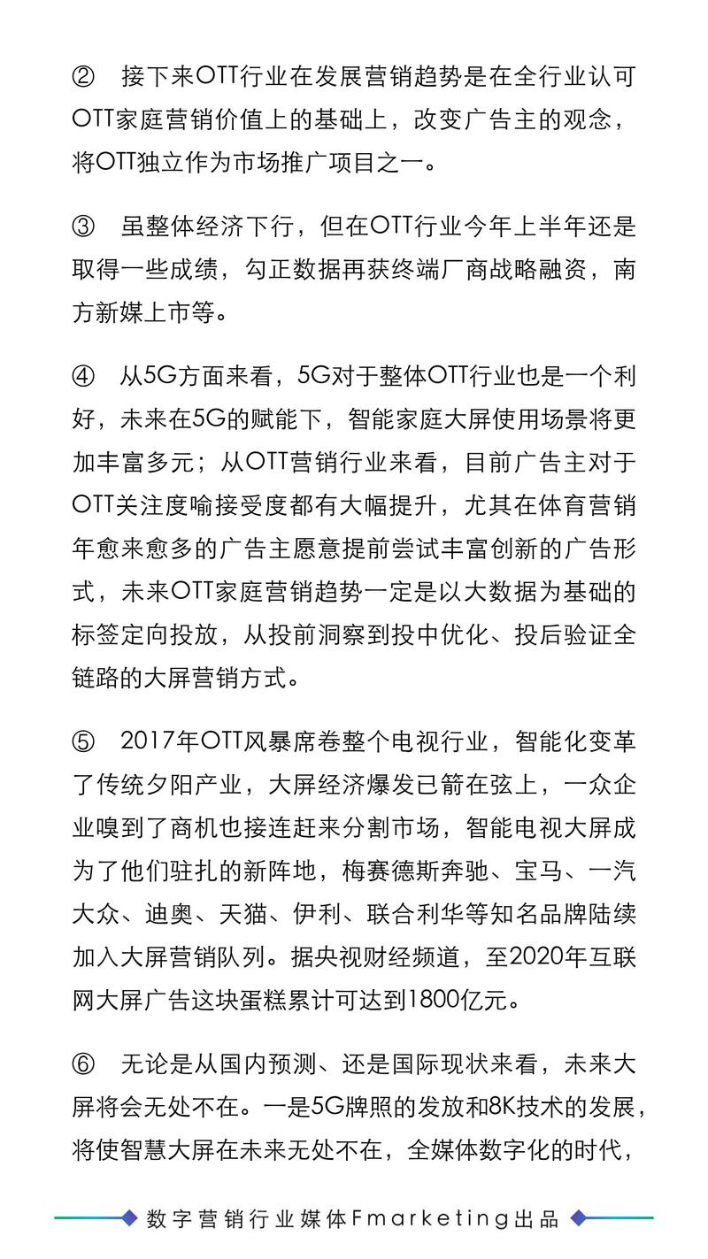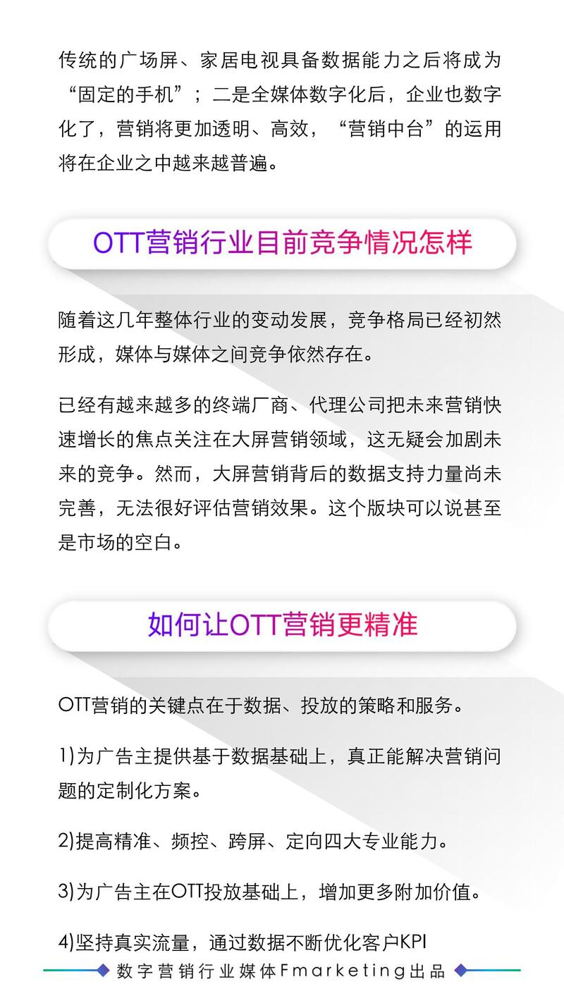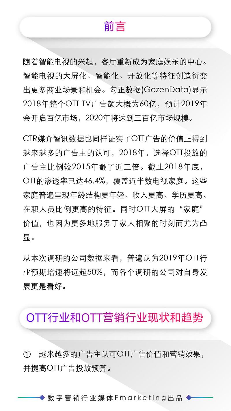 【流媒体网】摘要:随着这几年整体行业的变动发展,竞争格局已经初然形成,媒体与媒体之间竞争依然存在。已经有越来越多的终端厂商、代理公司把未来营销快速增长的焦点关注在大屏营销领域,这无疑会加剧未来的竞争。然而,大屏营销背后的数据支持力量尚未完善,无法很好评估营销效果。这个版块可以说甚至是市场的空白。从本次调研的公司数据来看,普遍认为2019年OTT行业预期增速将远超50%,而各个调研的公司对自身发展更是看好。