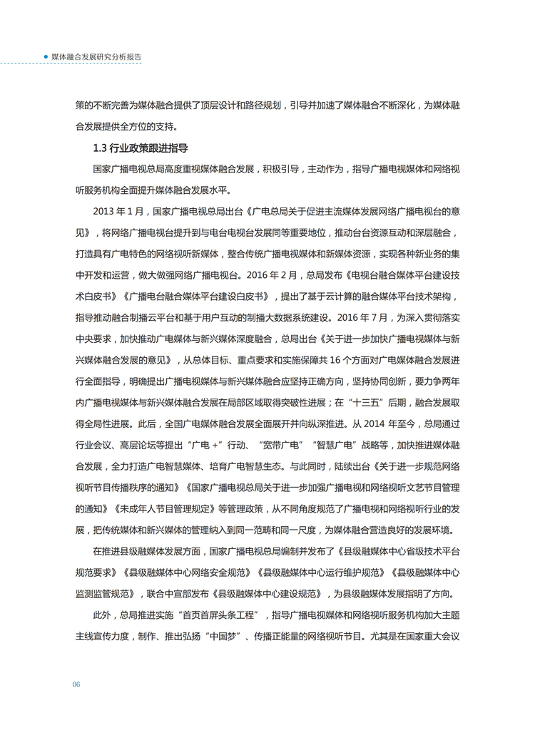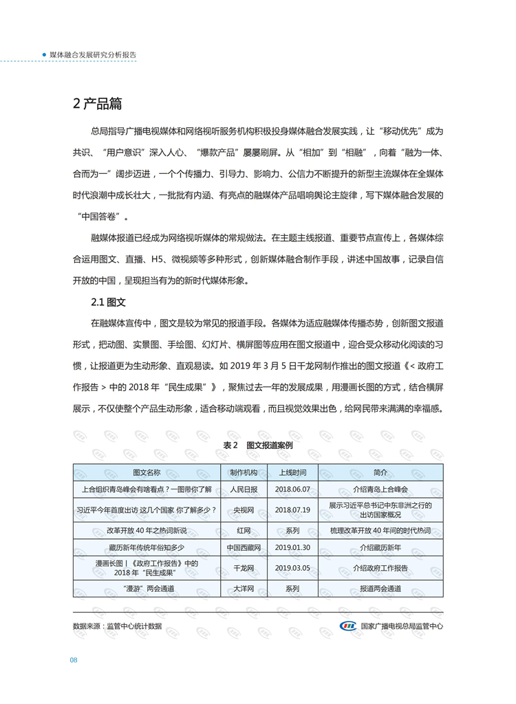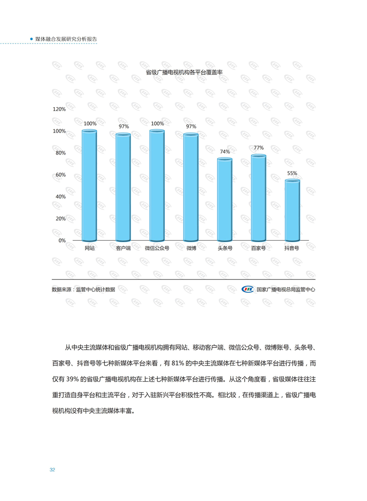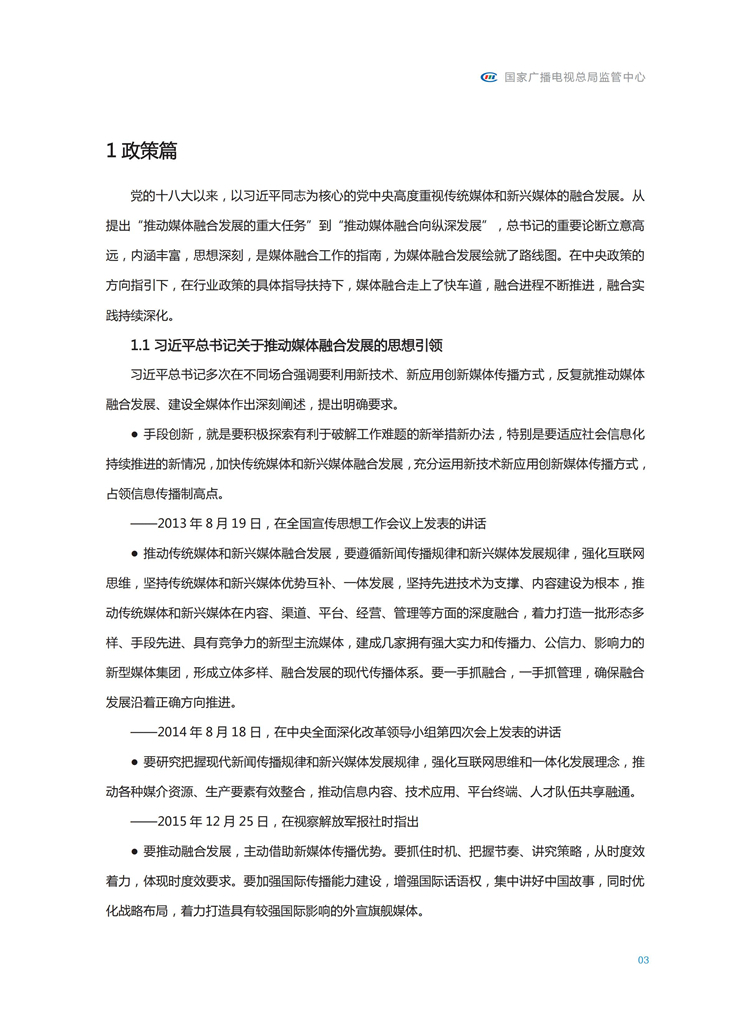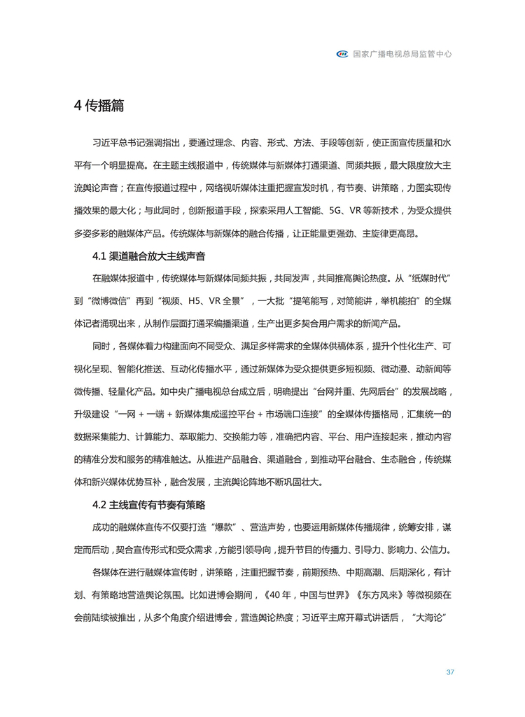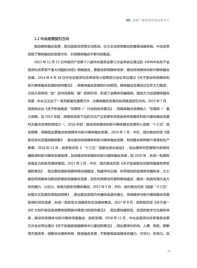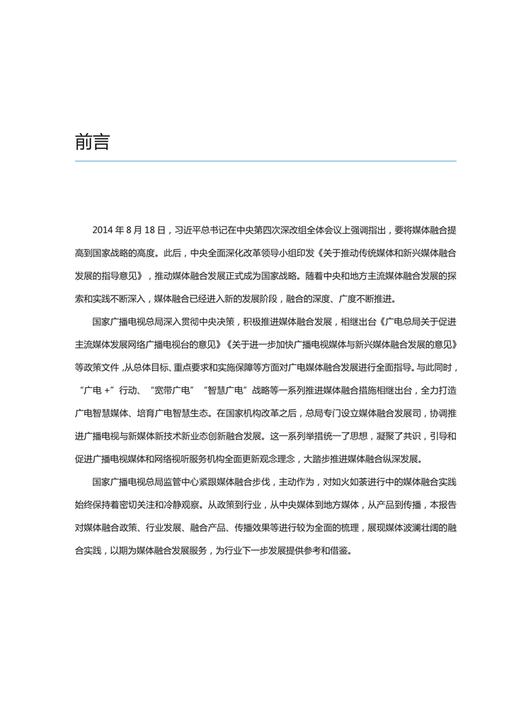 【流媒体网】摘要:国家广播电视总局监管中心紧跟媒体融合步伐,主动作为,对如火如荼进行中的媒体融合实践始终保持着密切关注和冷静观察。从政策到行业,从中央媒体到地方媒体,从产品到传播,本报告对媒体融合政策、行业发展、融合产品、传播效果等进行较为全面的梳理,展现媒体波澜壮阔的融合实践,以期为媒体融合发展服务,为行业下一步发展提供参考和借鉴。