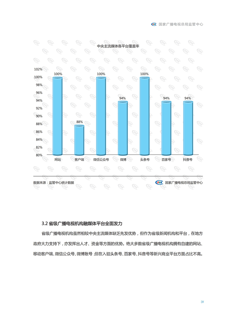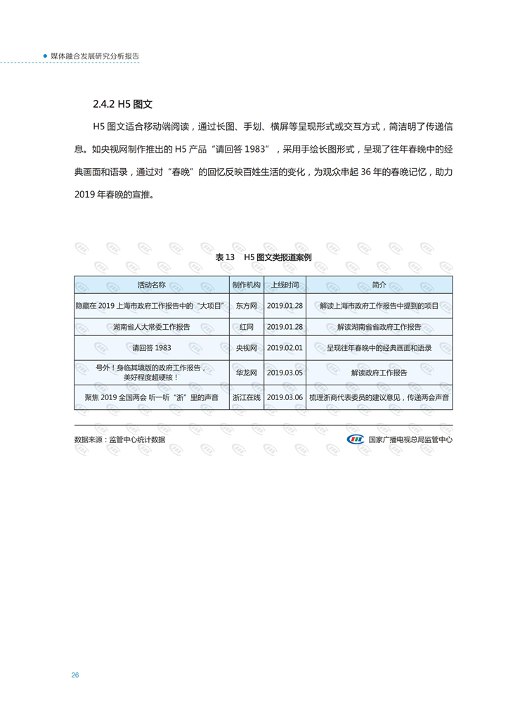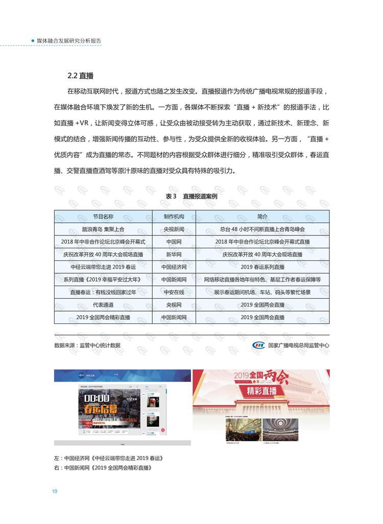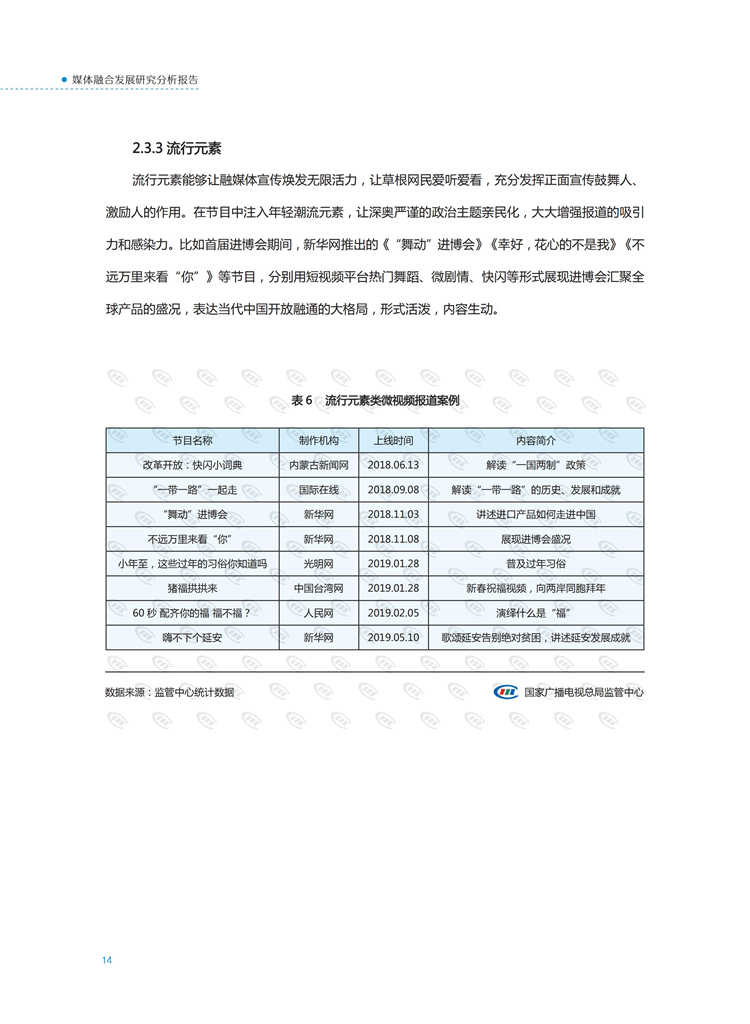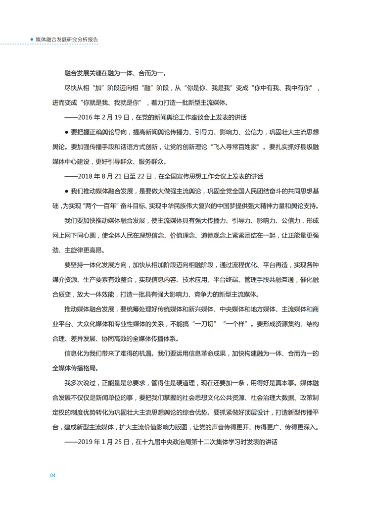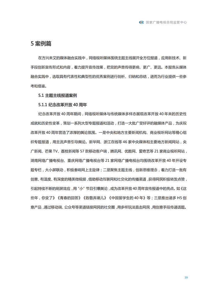 【流媒体网】摘要:国家广播电视总局监管中心紧跟媒体融合步伐,主动作为,对如火如荼进行中的媒体融合实践始终保持着密切关注和冷静观察。从政策到行业,从中央媒体到地方媒体,从产品到传播,本报告对媒体融合政策、行业发展、融合产品、传播效果等进行较为全面的梳理,展现媒体波澜壮阔的融合实践,以期为媒体融合发展服务,为行业下一步发展提供参考和借鉴。