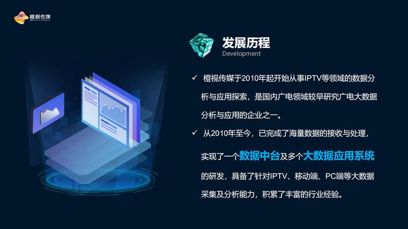 【流媒体网】消息:自2010年起,橙视传媒逐步构建起了多元化的数据传输、管理体系;2012年,与流媒体网联合发布《成都IPTV用户行为数据分析报告》;2016年底,IPTV数据分析系统等大数据研究成果获得了中宣部副部长、国家广电总局局长聂辰席的肯定,并于2017年受邀参与了由广电总局规划院牵头的《电视收视数据清洗规范》等三项行业规范的编制工作,行业影响力逐步提升;2020年,已经开始服务多家媒体机构。从数据监测、挖掘到最终的数据呈现,橙视传媒已经实现了全自动化。