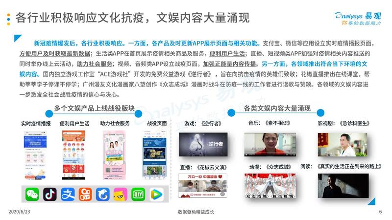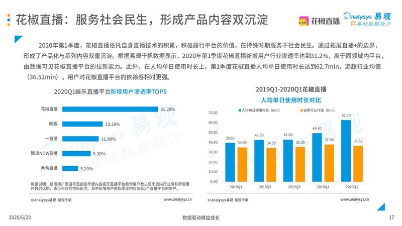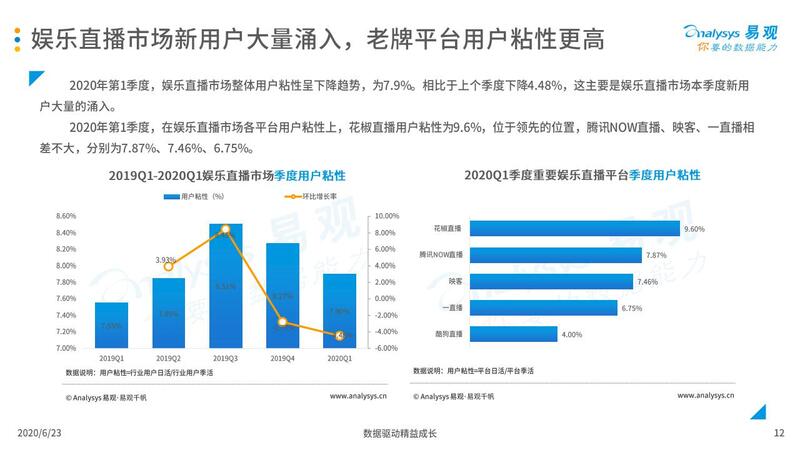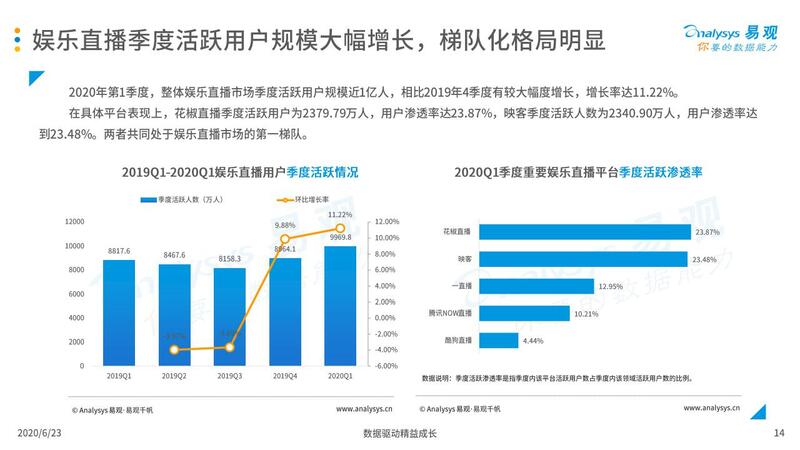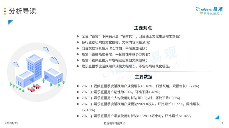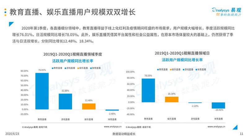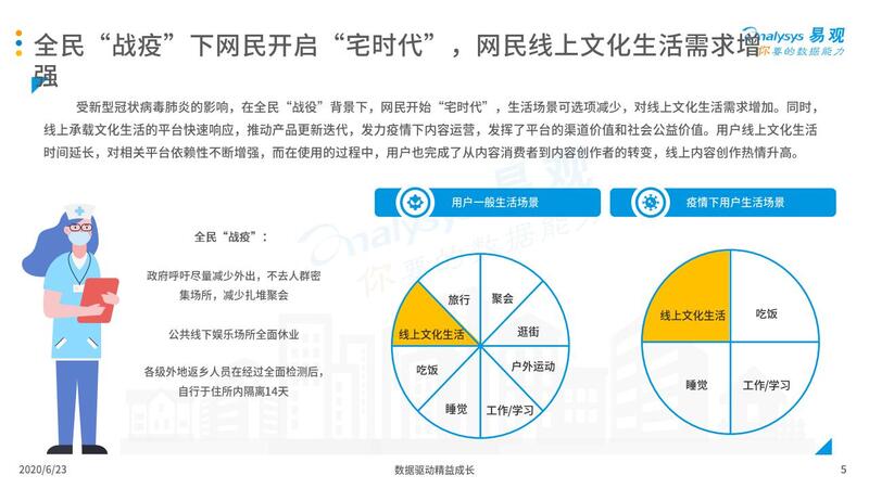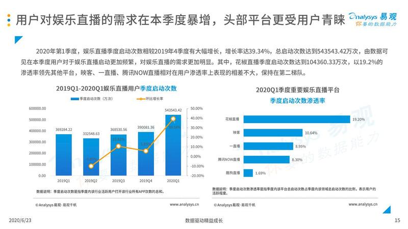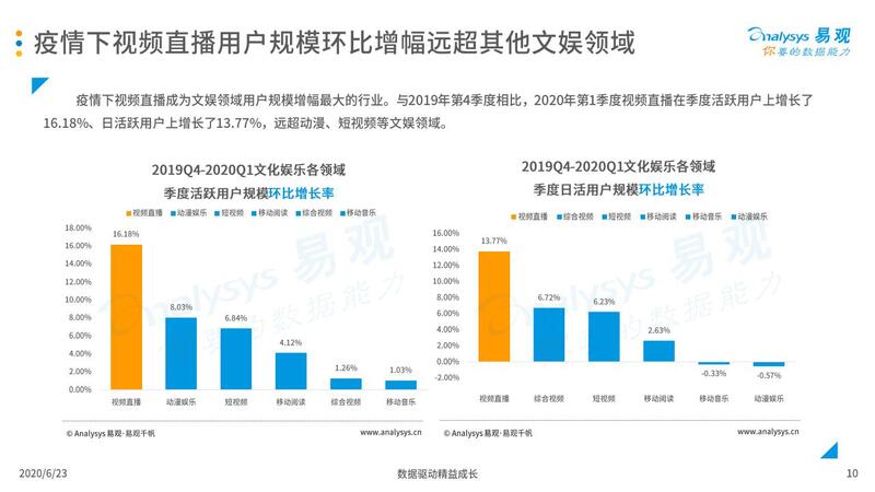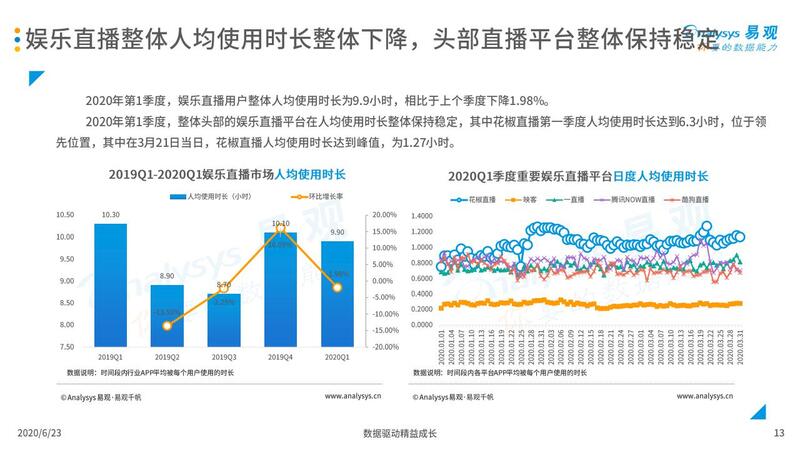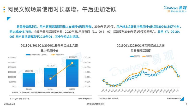 【流媒体网】摘要:新冠疫情爆发后,用户居家隔离期间线上文娱时长明显增加。2020年第1季度,用户线上文娱日均使用时长达到280968.39万小时,同比增加45.75%。在日均分时活跃度来看,2020年第1季度夜间(21∶00-6∶00)活跃度与2019年第1季度相差无几,日间(7∶00-20∶00)用户日活显著高于2019年Q1,其中午后尤为活跃。