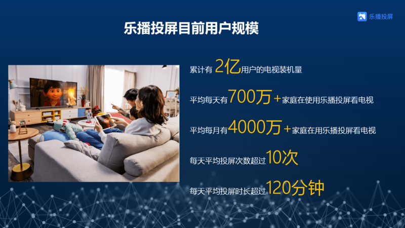 【流媒体网】摘要:平均每天有700万+家庭在使用乐播投屏看电视,平均每月有4000万+家庭在用乐播投屏看电视。