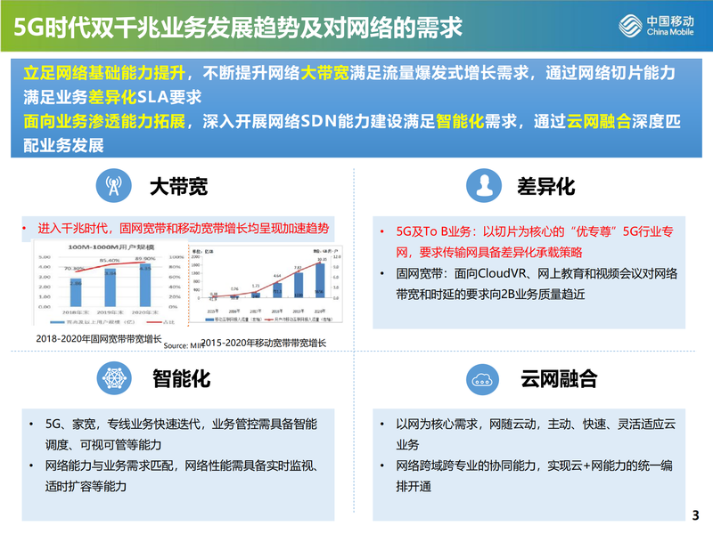 目前5G时代双千兆业务发展呈现两大趋势:立足网络基础能力提升,不断提升网络大带宽满足流量爆发式增长需求,通过网络切片能力满足业务差异化SLA要求;面向业务渗透能力拓展,深入开展网络SDN能力建设满足智能化需求,通过云网融合深度匹配业务发展。