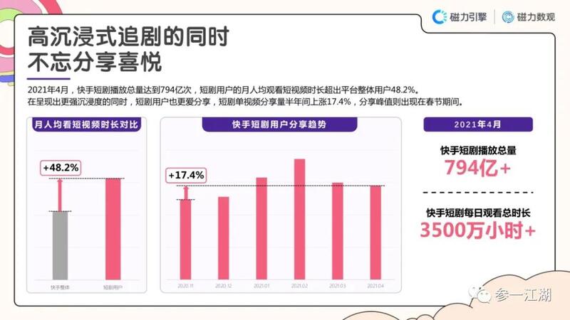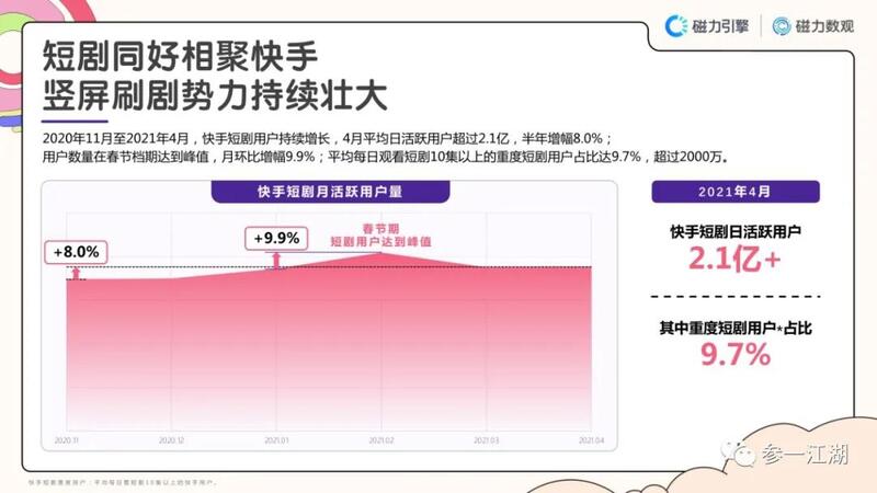 【流媒体网】摘要:快手短剧用户持续增长,4月平均日活跃用户超过2.1亿,半年增幅8.0%。(文末附有报告全文链接,欢迎今日流媒体VIP下载阅读!)