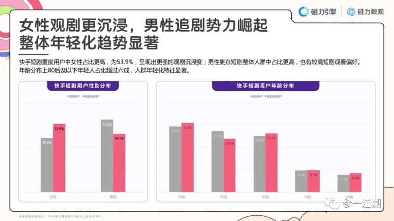 2020年11月至2021年4月,快手短剧用户持续增长,4月平均日活跃用户超过2.1亿,半年增幅8.0%;用户数量在春节档期达到峰值,月环比增幅9.9%;平均每日观看短剧10集以上的重度短剧用户占比达9.7%,超过2000万。快手短剧重度用户中女性占比更高,为53.9%,呈现出更强的观剧沉浸度;男性则在短剧整体人群中占比更高,也有较高短剧观看偏好。年龄分布上80后及以下年轻人占比超过六成,人群年轻化特征显著。