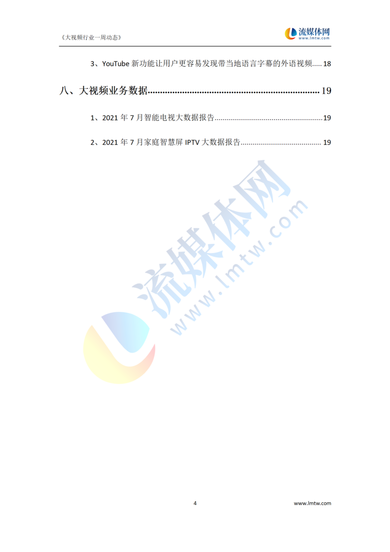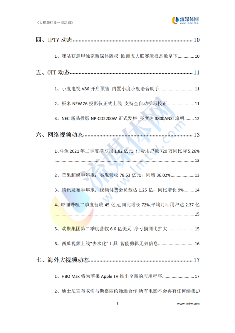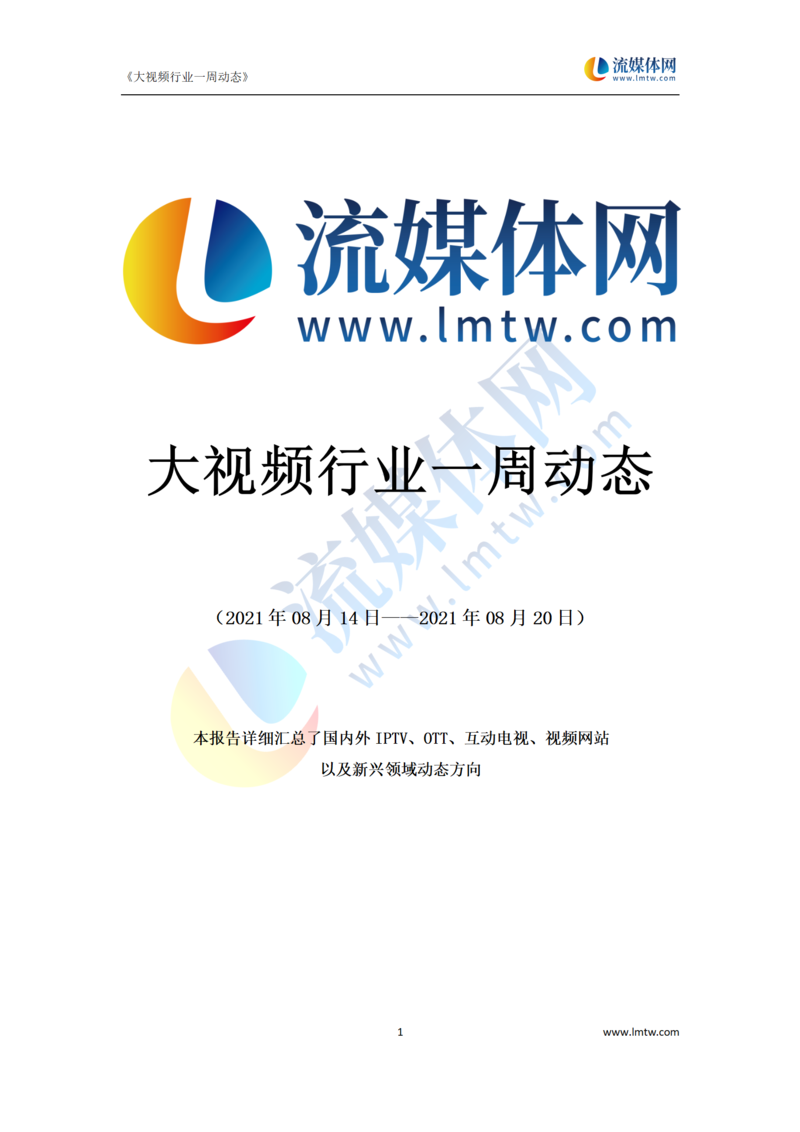 【流媒体网】摘要:本报告详细汇总了2021年8月14日—8月20日国内外IPTV、OTT、互动电视、视频网站以及新兴领域动态方向,供业界参考!今日流媒体vip可免费获取报告PDF版,详情请见文末。