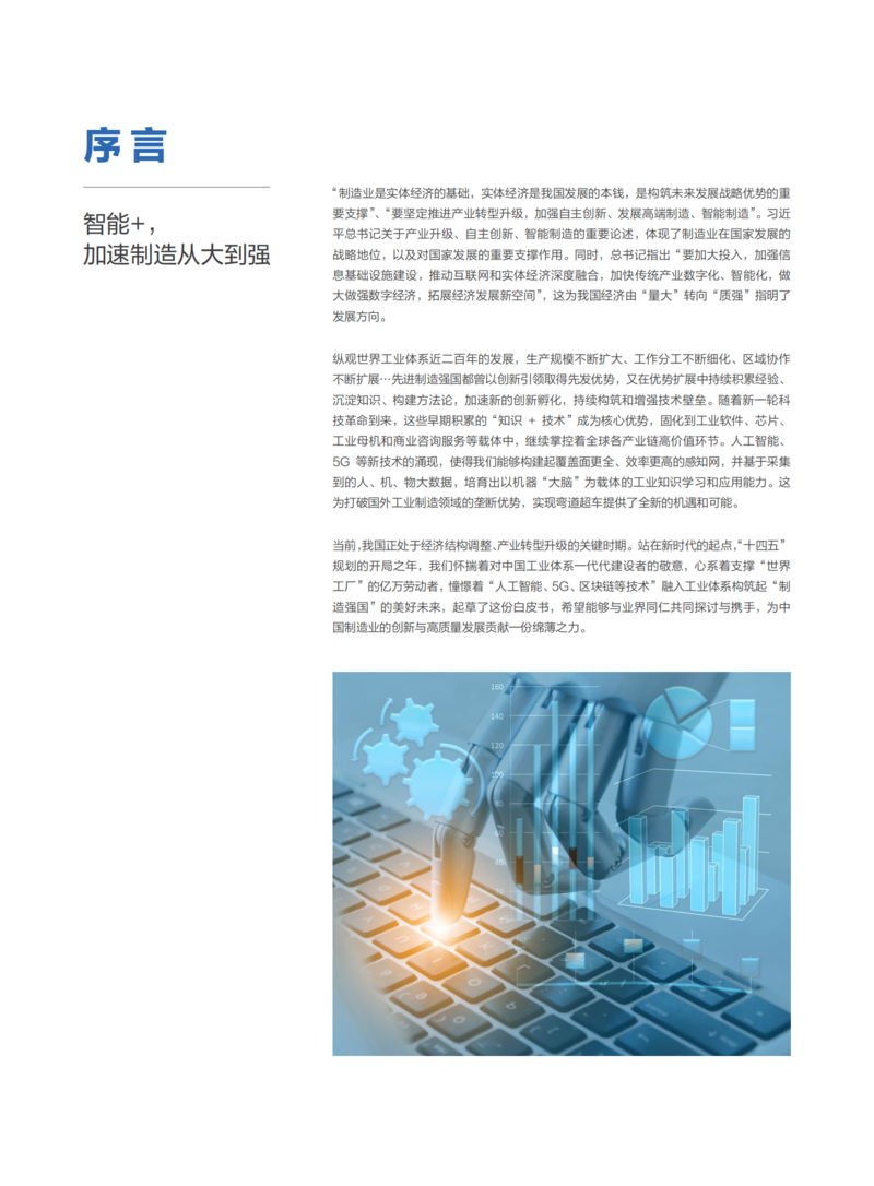当前,我国正处于经济结构调整、产业转型升级的关键时期。站在新时代的起点,“十四五”规划的开局之年,我们怀揣着对中国工业体系一代代建设者的敬意,心系着支撑“世界工厂”的亿万劳动者,憧憬着“人工智能、5G、区块链等技术”融入工业体系构筑起“制造强国”的美好未来,起草了这份白皮书,希望能够与业界同仁共同探讨与携手,为中国制造业的创新与高质量发展贡献一份绵薄之力。