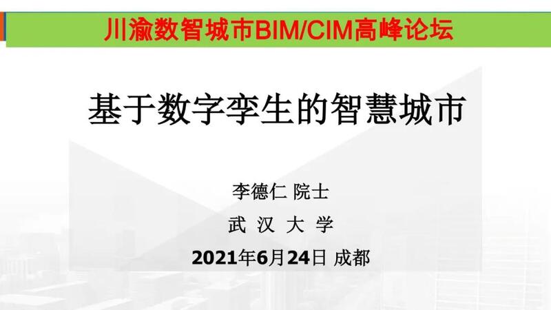 中国科学院院士、中国工程院院士、武汉大学教授李德仁先生在川渝数智城市BIM/CIM高峰论坛演讲的《基于数字孪生的智慧城市》,共计70页PPT,分享给大家。