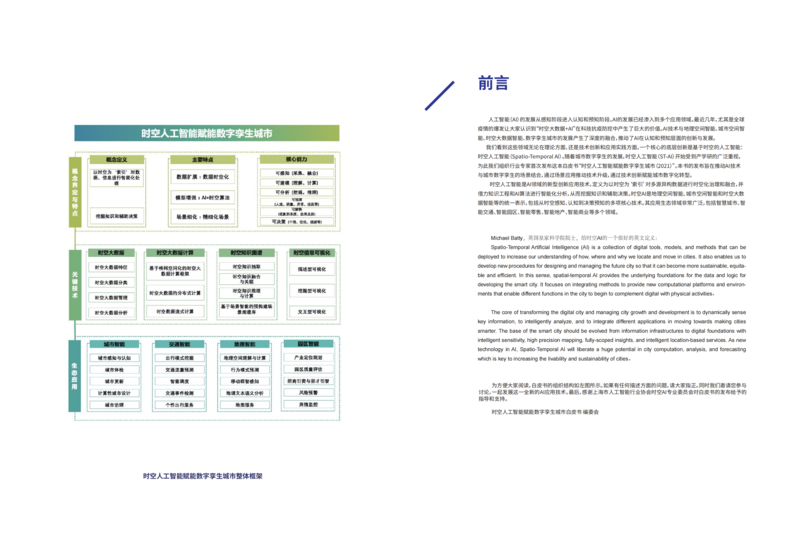 这些领域无论在理论方面、还是技术创新和应用实践方面,一个核心的底层创新是基于时空的人工智能:时空人工智能(Spatio-Temporal AI)。随着城市数字孪生的发展,时空人工智能(ST-AI)开始受到产学研的广泛重视,本白皮书的发布旨在推动AI技术与城市数字孪生的场景结合,通过场景应用推动技术升级,通过技术创新赋能城市数字化转型。
