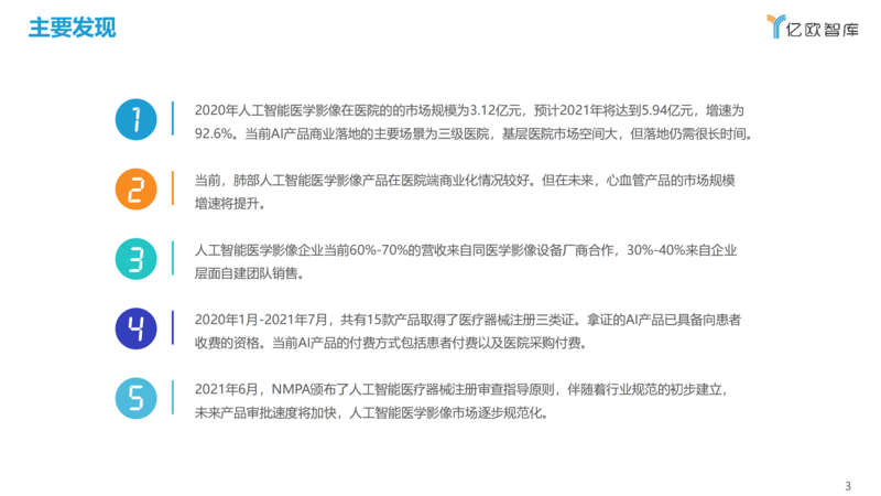 2021年6月,NMPA颁布了人工智能医疗器械注册审查指导原则,伴随着行业规范的初步建立,未来产品审批速度将加快,人工智能医学影像市场逐步规范化。