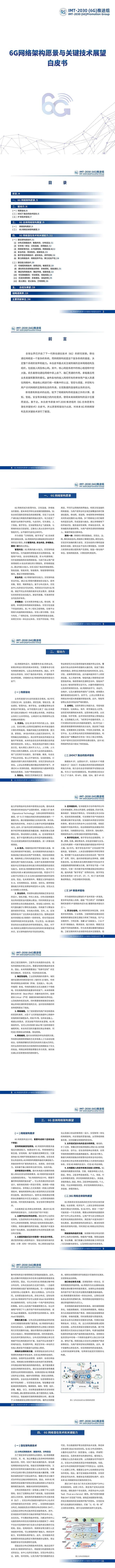 《6G网络架构愿景与关键技术展望》白皮书是全球首个多方联合发布的6G网络架构白皮书,由IMT-2030(6G)网络技术组34家单位共同完成。白皮书首次提出了面向DOICT融合创新的发展思路,从业务驱动、DOICT融合驱动、IP新技术驱动三方面阐述了6G网络架构演进的驱动力;提出6G网络架构设计原则包括“2个坚持”和“4个转变”,即“坚持网络兼容”、“坚持智简设计”,以及“集中向分布转变、增量向一体转变、外挂向内生转变、地面向泛在转变”。白皮书还重点阐述了分布式自治的6G网络架构愿景,并对6G网络的12个潜在关键技术进行了介绍,包括算力网络(CFN)、空天地一体化组网等。段晓东表示,网络架构是移动通信系统的基座,6G网络架构的设计任重而道远;产业界需要集合力量、共同探索,在网络架构和关键技术上形成一致观点,推动形成全球统一标准。