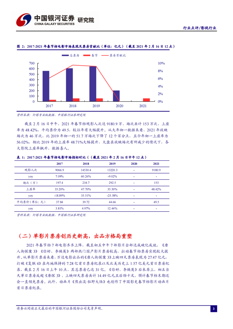 【流媒体网】摘要:据灯塔专业版数据统计显示,2021 年春节档截至目前(2021 年 2 月 16 日 11 点半),票房共计 56.97 亿元(剔除票务服务费),已创中国影史纪录。正月初一当天全国电影票房达 15.43 亿元,超过 2019 年创造的 13.68 亿元的单日票房纪录,且初一至初四单日票房较往年数据都有显著增长。其中《唐人街探案 3》从预售阶段票房就遥遥领先,上映首日票房高达 9.21 亿元,已创下中国影史单片单日票房新高及单日全球最高票房纪录。(文末附有报告全文链接,欢迎今日流媒体VIP会员下载阅读!)