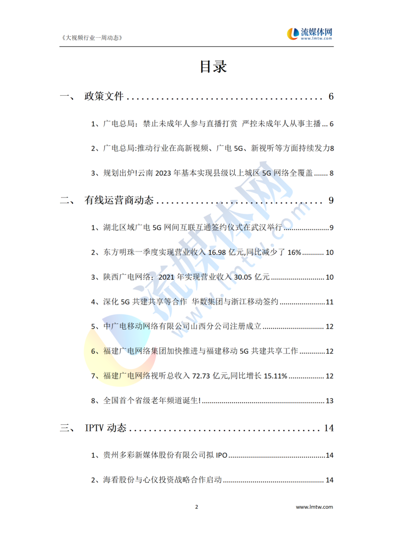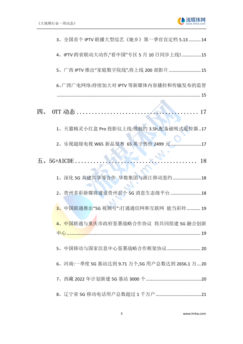 【流媒体网】摘要:本报告详细汇总了2022年4月30日—5月13日国内外IPTV、OTT、互动电视、视频网站以及新兴领域动态方向,供业界参考!今日流媒体vip可免费获取报告PDF版,详情请见文末。