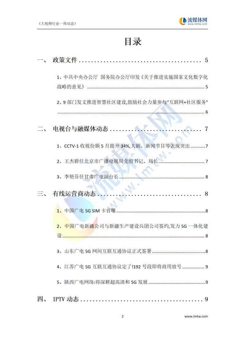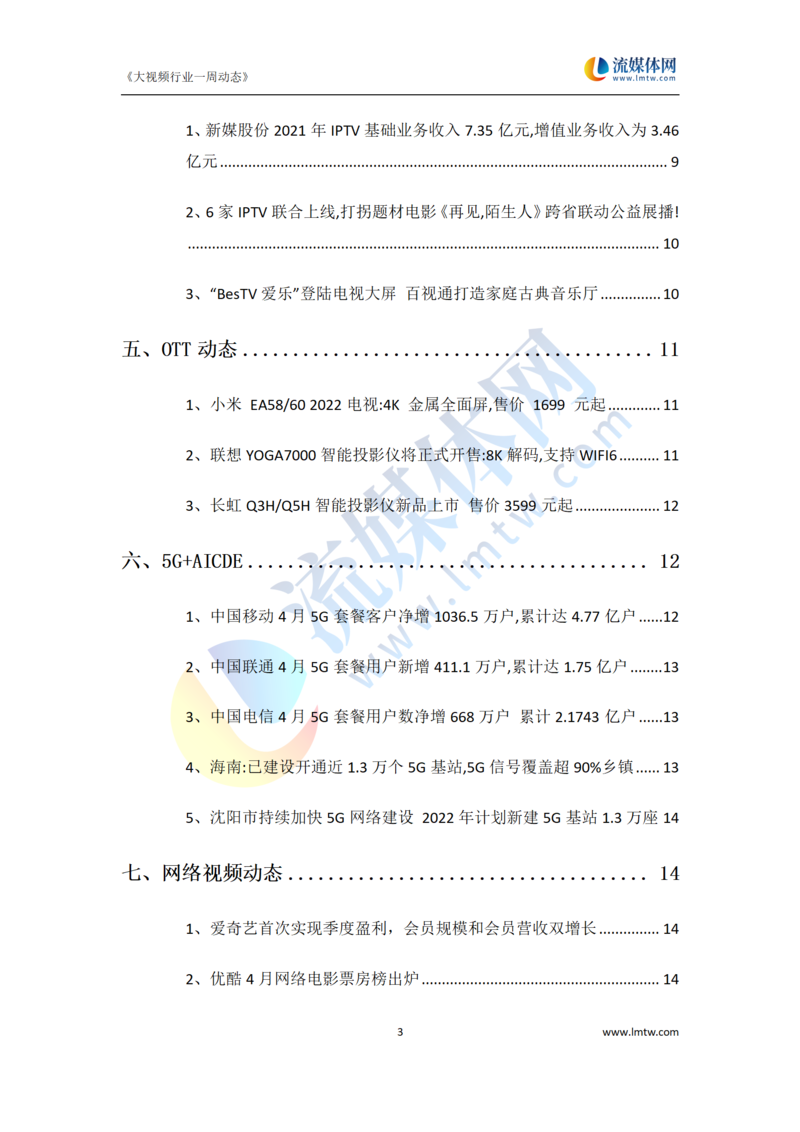 【流媒体网】摘要:本报告详细汇总了2022年5月21日—5月27日国内外IPTV、OTT、互动电视、视频网站以及新兴领域动态方向,供业界参考!今日流媒体vip可免费获取报告PDF版,详情请见文末。