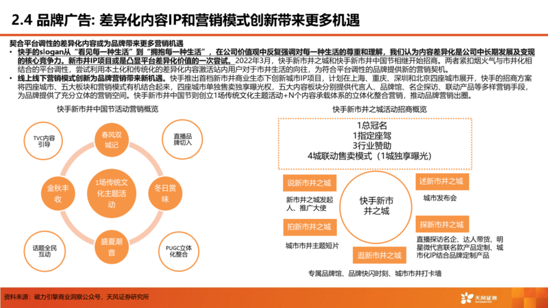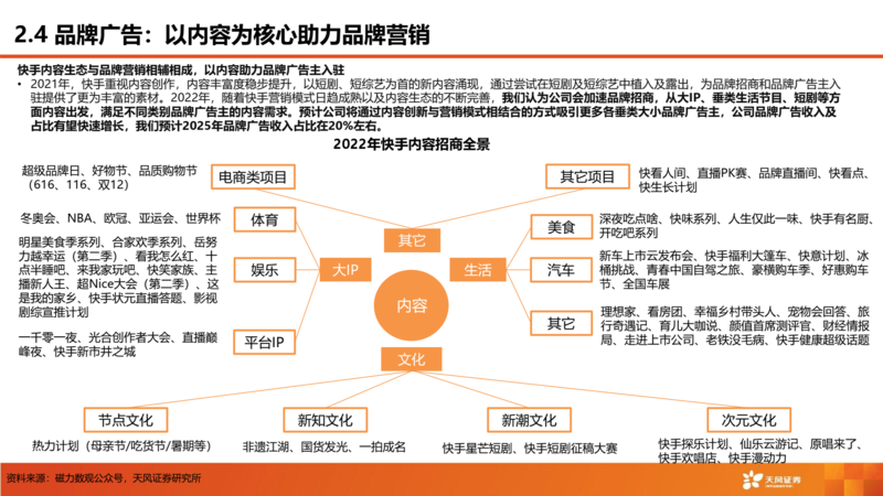 内容方面,UGC创作者生态的持续维护、发展垂类达人和版权内容的引入,使快手内容生态逐步完善,快手通过内容IP及丰富的版权内容持续赋能创作者,内容生态的逐步完善是拉新和提高用户黏性的关键点,内容差异化或是快手长远健康发展的核心。