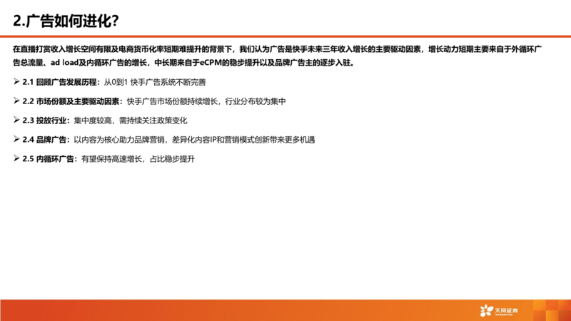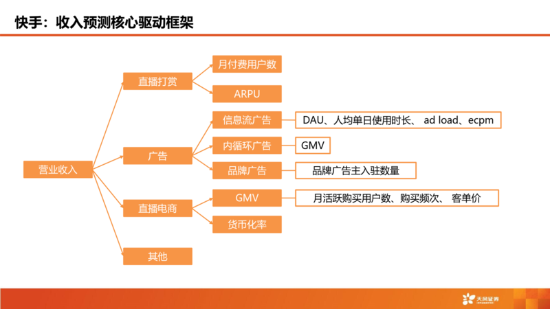 在直播打赏收入增长空间有限及电商货币化率短期难提升的背景下,我们认为广告是快手未来三年收入增长的主要驱动因素,增长动力短期主要来自于外循环广告总流量、ad load及内循环广告的增长,中长期来自于eCPM的稳步提升以及品牌广告主的逐步入驻。