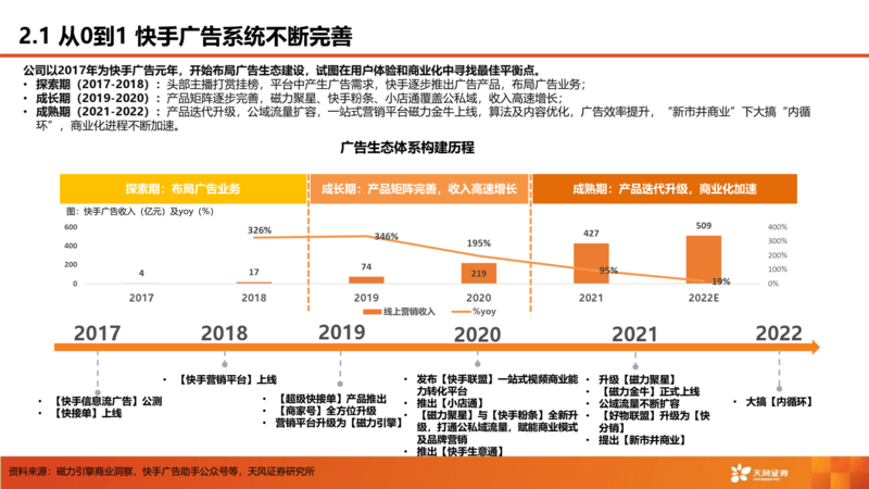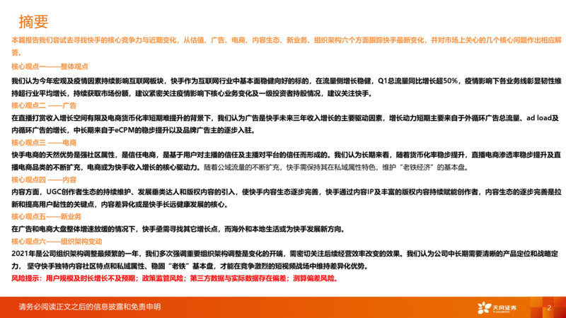 2021年是公司组织架构调整最频繁的一年,我们多次强调重要组织架构调整是变化的开端,需密切关注后续经营效率改变的效果。我们认为公司中长期需要清晰的产品定位和战略定力, 坚守快手独特内容社区特点和私域属性、稳固“老铁”基本盘,才能在竞争激烈的短视频战场中维持差异化优势。