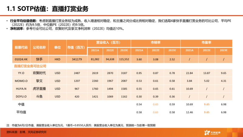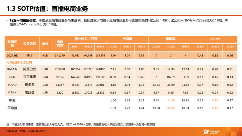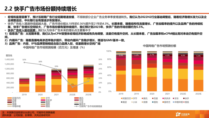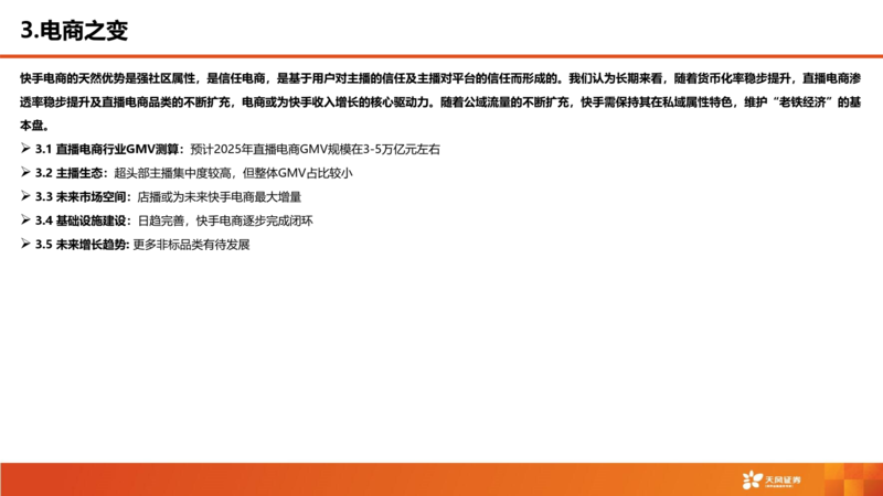 快手电商的天然优势是强社区属性,是信任电商,是基于用户对主播的信任及主播对平台的信任而形成的。我们认为长期来看,随着货币化率稳步提升,直播电商渗透率稳步提升及直播电商品类的不断扩充,电商或为快手收入增长的核心驱动力。随着公域流量的不断扩充,快手需保持其在私域属性特色,维护“老铁经济”的基本盘。