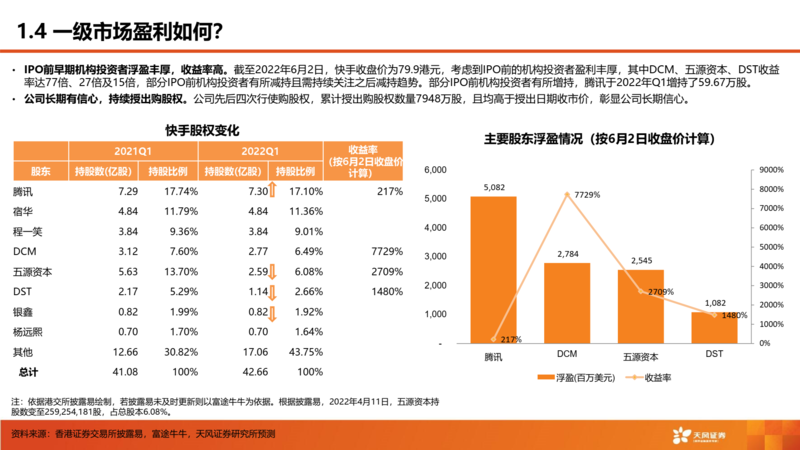 我们认为今年宏观及疫情因素持续影响互联网板块,快手作为互联网行业中基本面稳健向好的标的,在流量侧增长稳健,Q1总流量同比增长超50%,疫情影响下各业务线彰显韧性维持超行业平均增长,持续获取市场份额,建议紧密关注疫情影响下核心业务变化及一级投资者持股情况,建议关注快手。