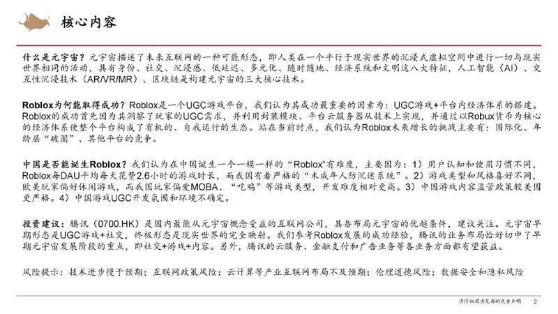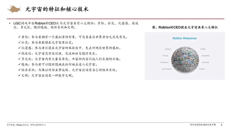 【流媒体网】摘要:UGC游戏平台Roblox的CEO认为元宇宙具有八大特征:身份、社交、沉浸感、低延迟、多元化、随时随地、经济系统和文明。(文末附有报告全文链接,欢迎今日流媒体VIP会员下载阅读!)