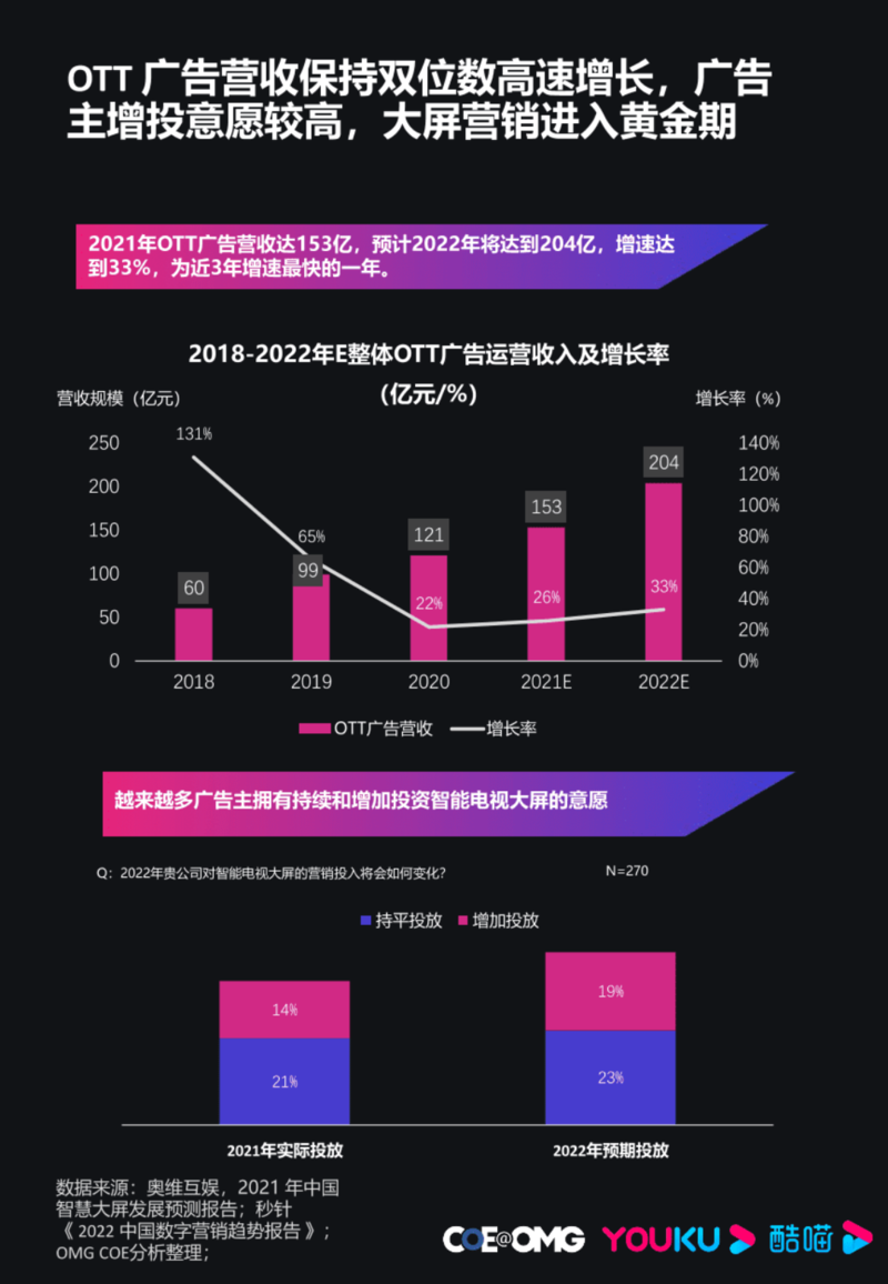 【流媒体网】摘要:随着传统品牌广告资源出现瓶颈,家庭智能大屏作为新价值流量备受广告主关注,OTT TV广告流量份额持续增长。
