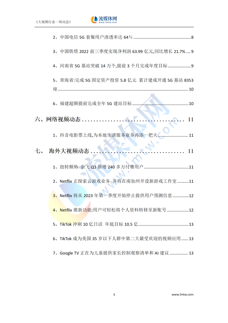 【流媒体网】摘要:本报告详细汇总了2022年10月15日—10月21日国内外IPTV、OTT、互动电视、视频网站以及新兴领域动态方向,供业界参考!今日流媒体vip可免费获取报告PDF版,详情请见文末。