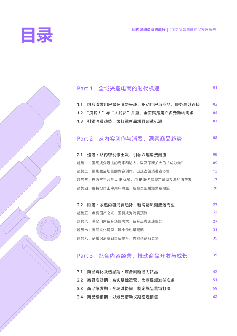 为了进一步解决品牌在商品层面关心的问题,抖音电商发布了《用内容创造消费流行 | 2022抖音电商商品发展报告》,从抖音电商平台内容创作与消费趋势出发,对抖音电商商品趋势展开分析,并针对商品孵化、启动、爆发、续销的经营全过程提出方法引导,助力广大商家在快速进化的市场中把握风向,抓住下一个增长点,用内容创造消费流行。