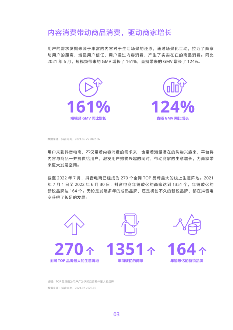 另一方面,“货找人”与“人找货”并重,全面满足用户多元购物需求。在抖音电商,用户不仅有内容消费的需求,也伴随着大量潜在的购物兴趣,越来越多的用户在看到有趣的内容时会主动搜索,主动点开商城逛一逛。抖音电商打通了“货找人”与“人找货”的双重消费路径,兴趣激发与转化承接高效配合,为商家创造生意增量。同比2021年6月,电商意图搜索PV增长了143%;商城访问PV增长了518%,商城GMV同比增长了434%;店铺访问PV增长了197%,店铺GMV增长了428%。