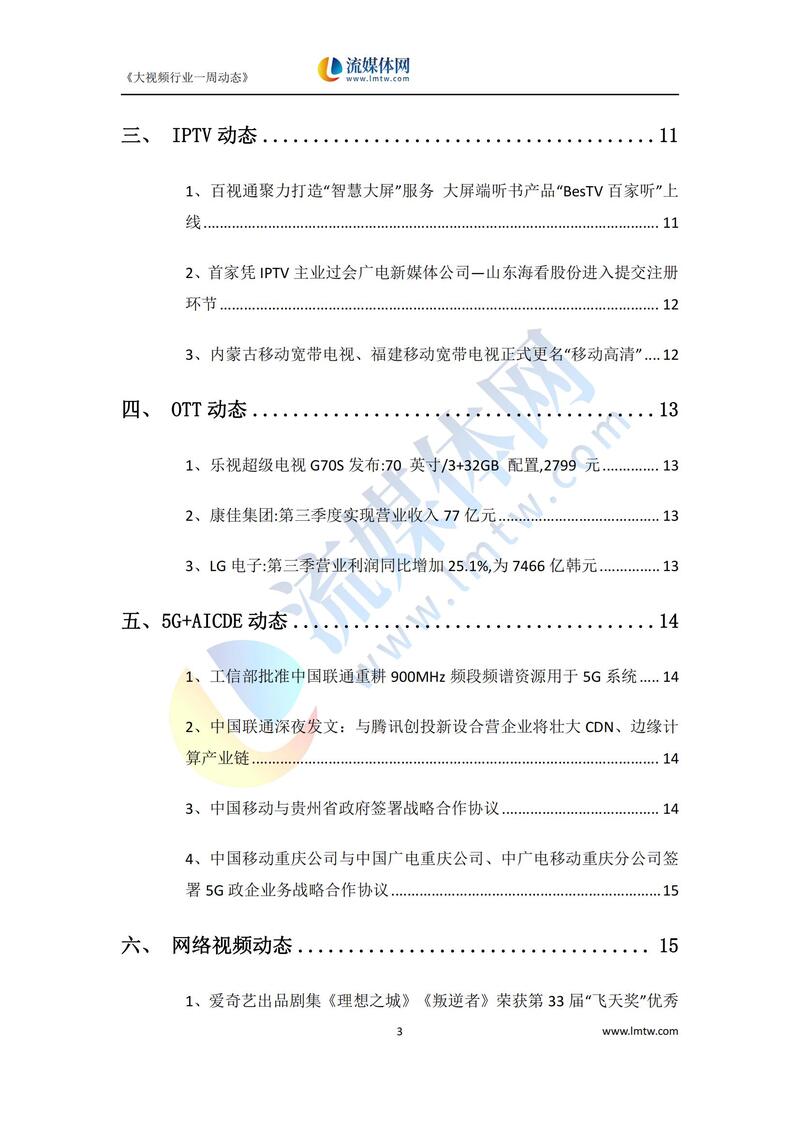 【流媒体网】摘要:本报告详细汇总了2022年10月29日—11月04日国内外IPTV、OTT、互动电视、视频网站以及新兴领域动态方向,供业界参考!今日流媒体vip可免费获取报告PDF版,详情请见文末。