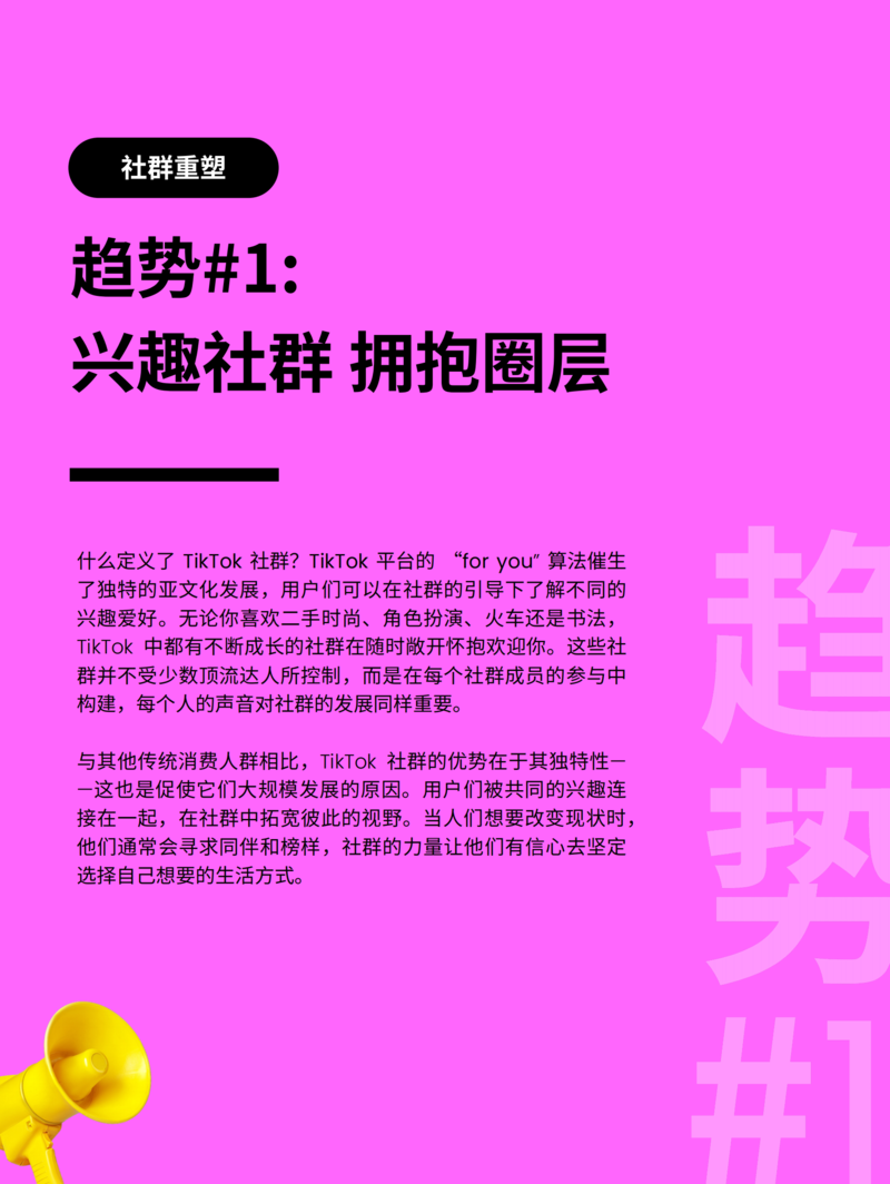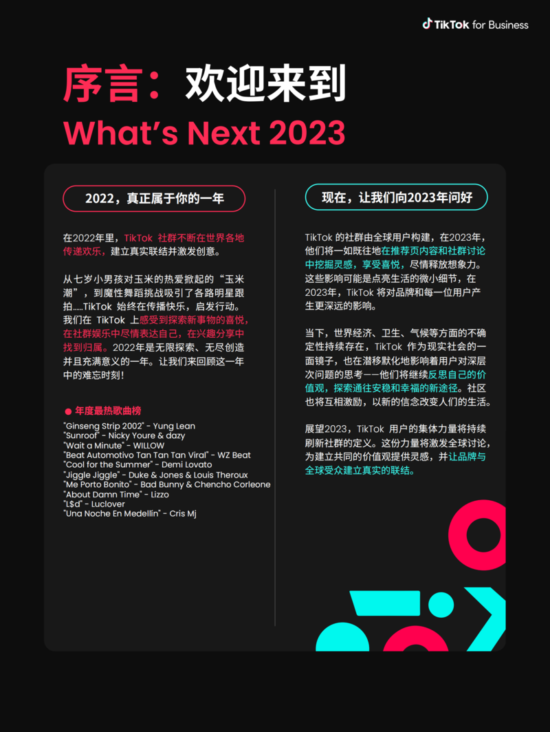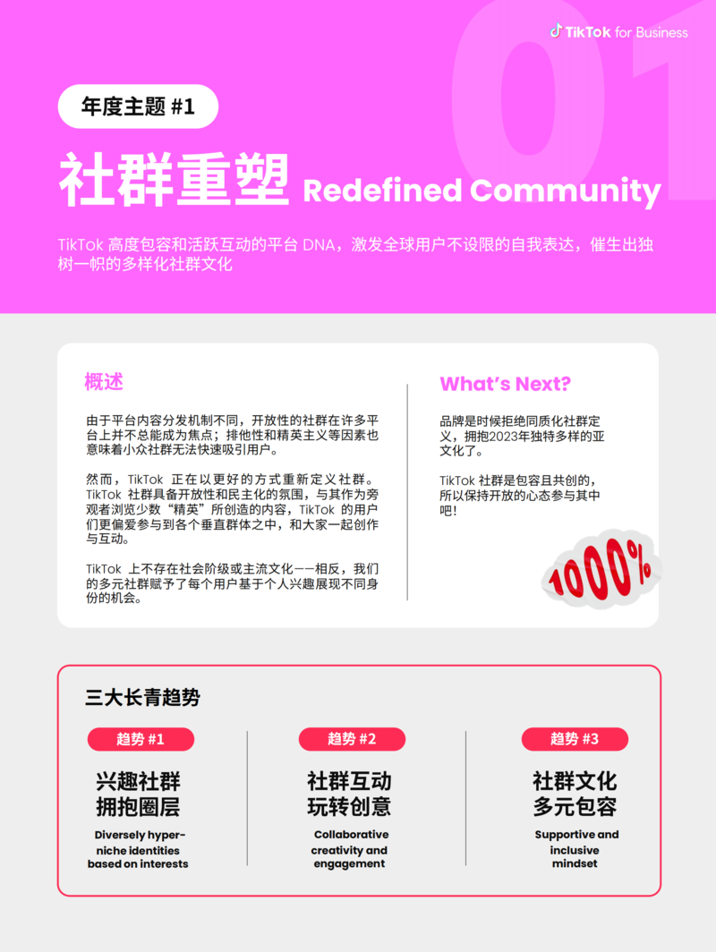 【流媒体网】摘要:展望2023,TikTok ⽤⼾的集体⼒量将持续刷新社群的定义。这份⼒量将激发全球讨论,为建⽴共同的价值观提供灵感,并让品牌与全球受众建⽴真实的联结。(文末附有报告全文链接,欢迎今日流媒体VIP会员下载阅读!)