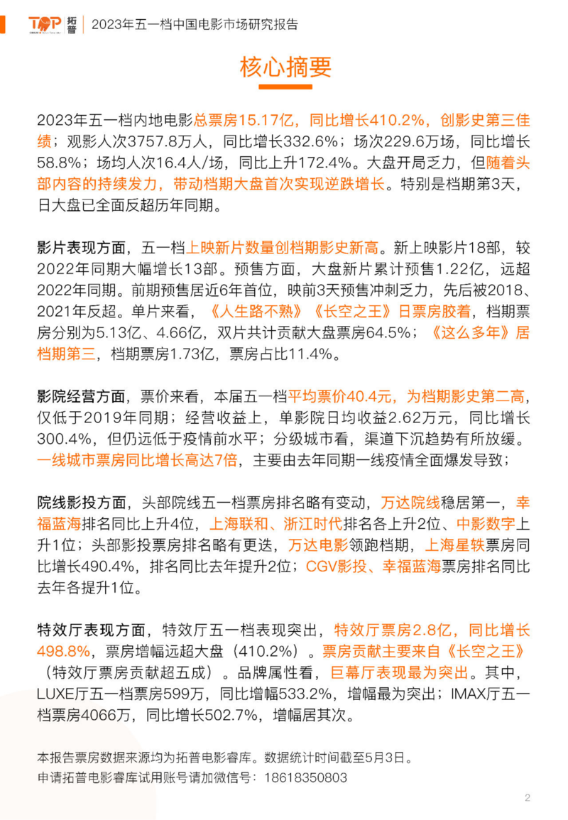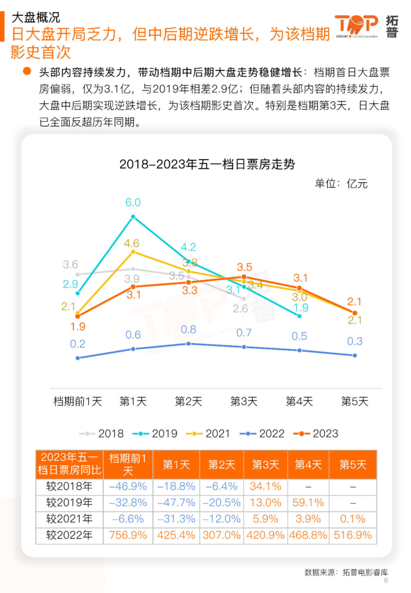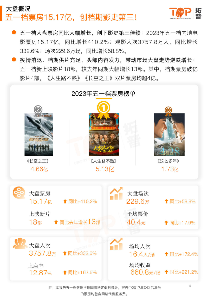 【流媒体网】摘要:2023年五一档内地电影总票房15.17亿,同比增长410.2%,创影视第三佳绩。(文末附有报告全文链接,欢迎今日流媒体VIP会员下载阅读!)