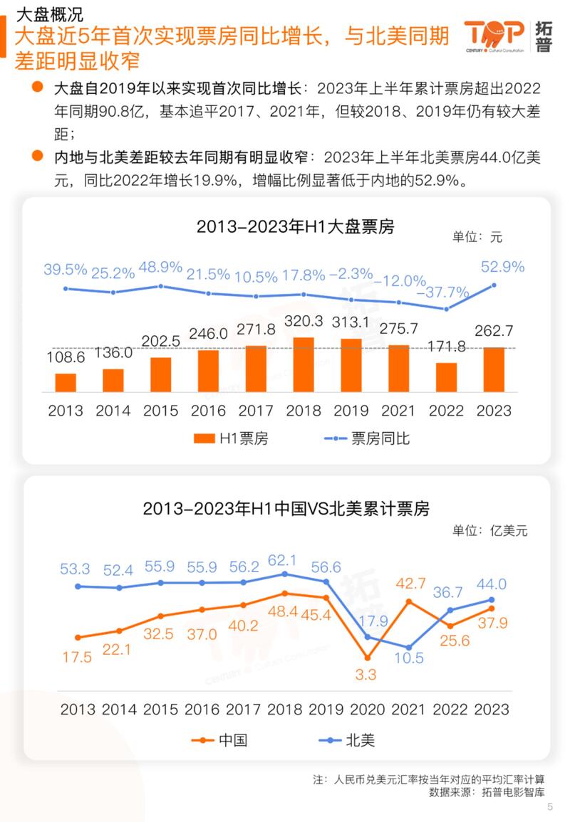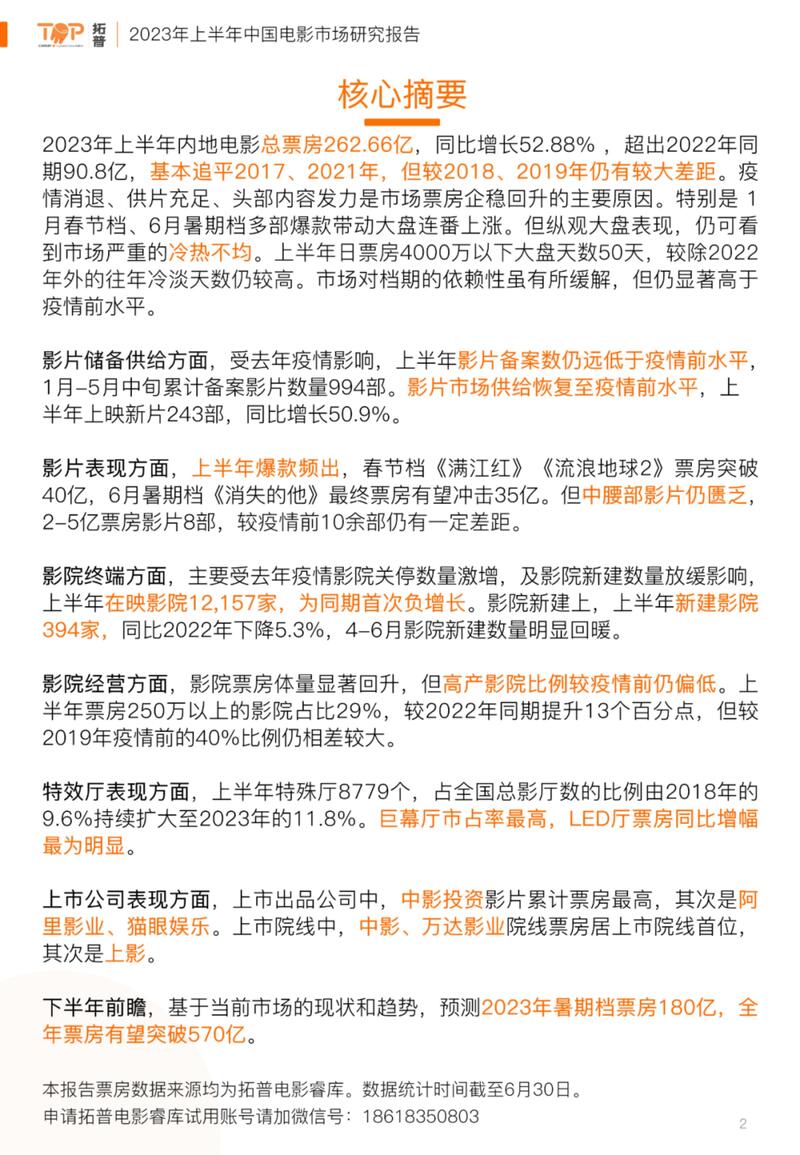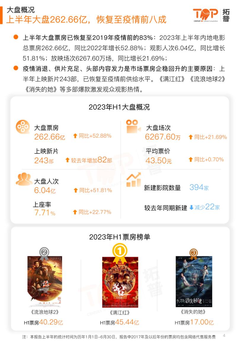 【流媒体网】摘要:2023年上半年内地电影总票房262.66亿,同比增长52.88% ,超出2022年同期90.8亿,基本追平2017、2021年,但较2018、2019年仍有较大差距。(文末附有报告全文链接,欢迎今日流媒体VIP会员下载阅读!)