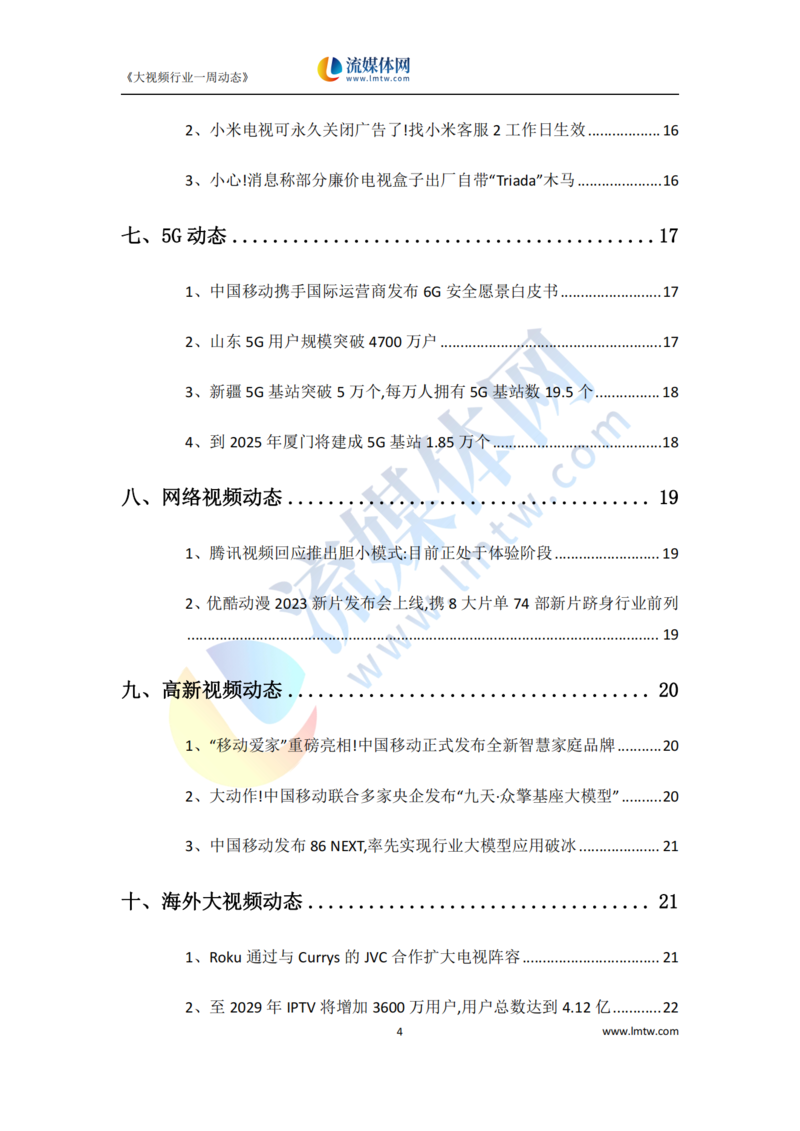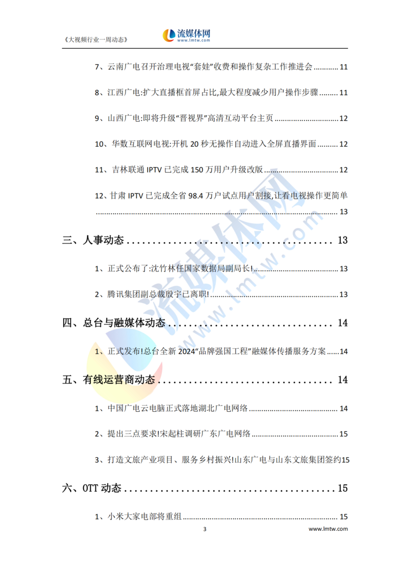 【流媒体网】摘要:本报告详细汇总了2023年10月07日—10月13日国内外IPTV、OTT、互动电视、视频网站以及新兴领域动态方向,供业界参考!今日流媒体vip可免费获取报告PDF版,详情请见文末。