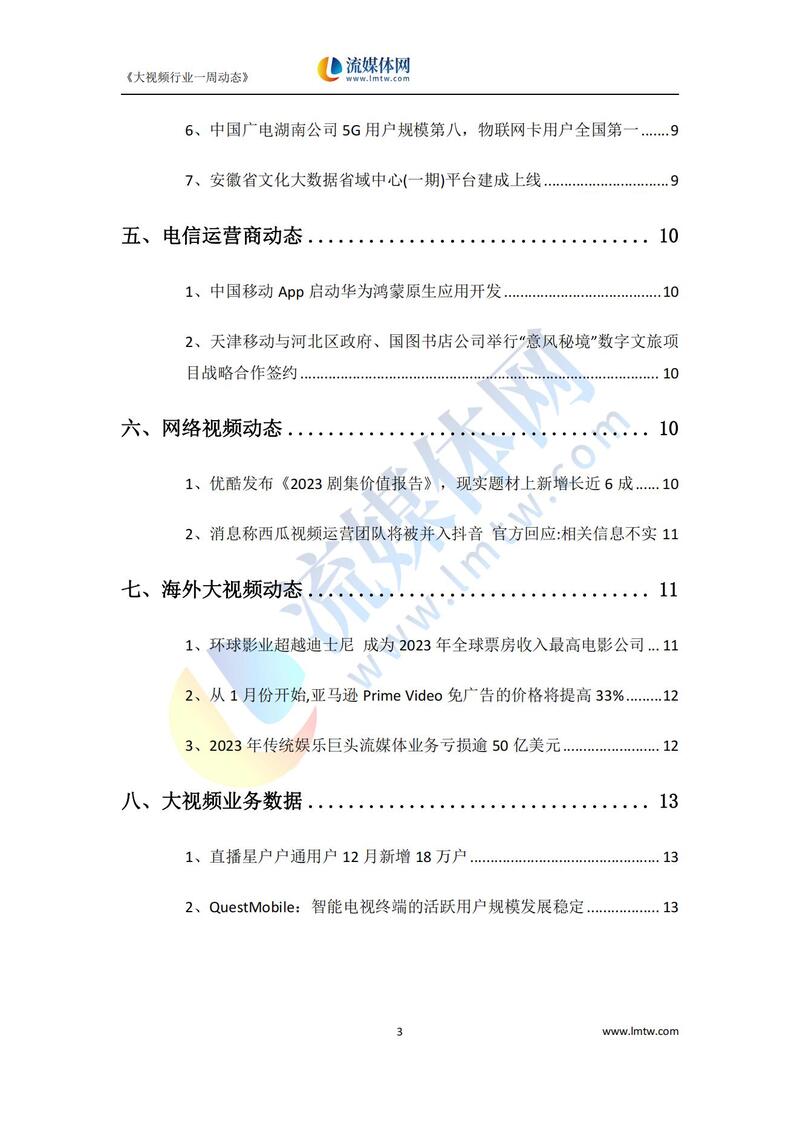 【流媒体网】摘要:本报告详细汇总了2023年12月30日—2024年1月05日国内外IPTV、OTT、互动电视、视频网站以及新兴领域动态方向,供业界参考!