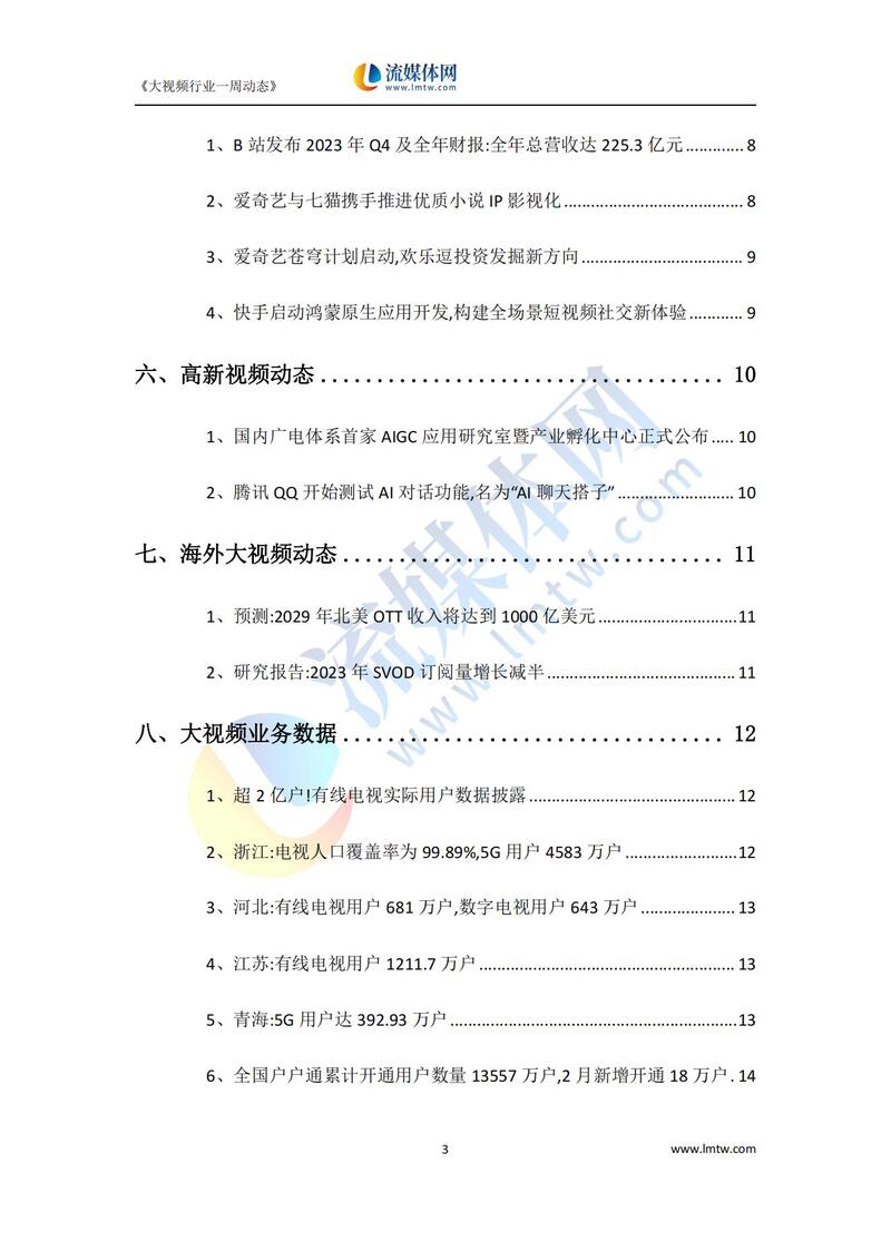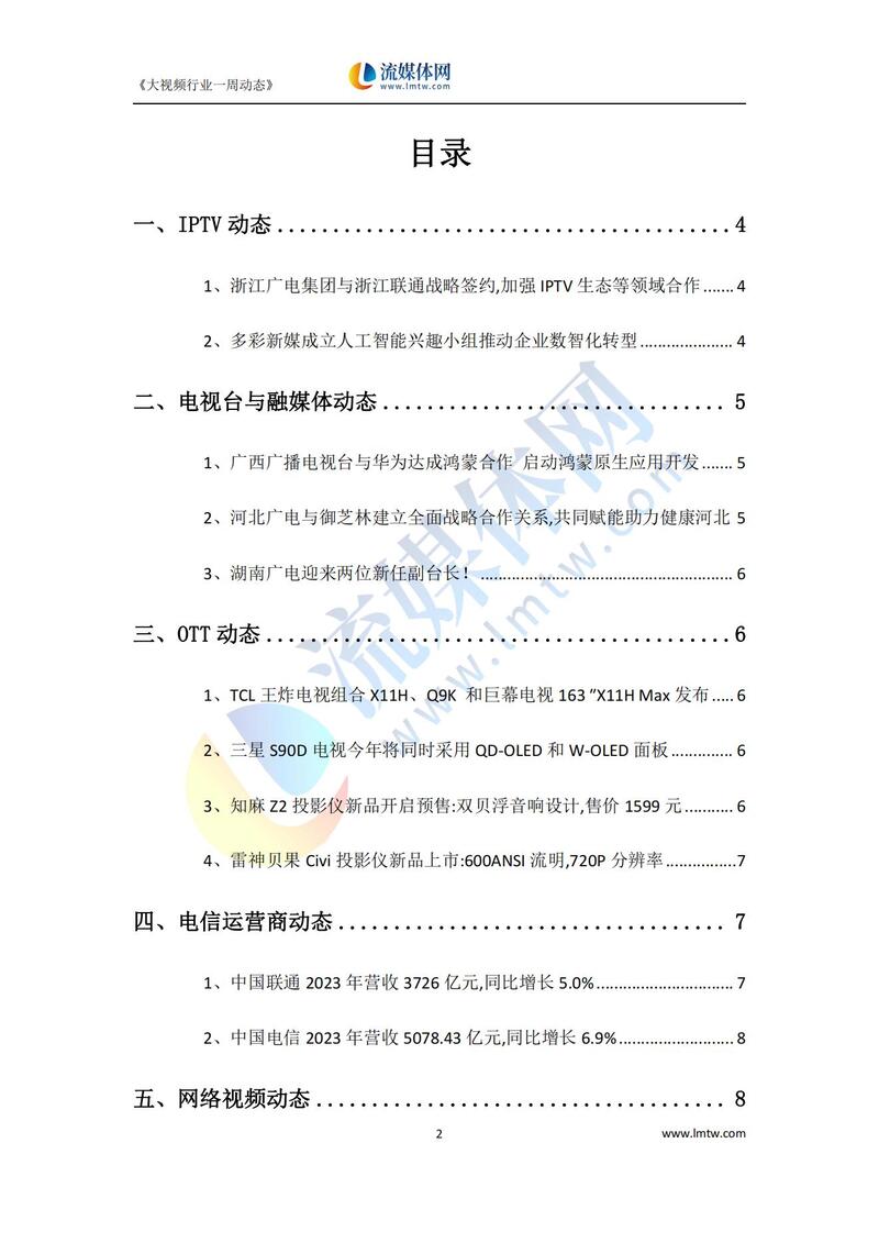【流媒体网】摘要:本报告详细汇总了2024年3月02日—2024年3月08日国内外IPTV、OTT、互动电视、视频网站以及新兴领域动态方向,供业界参考!