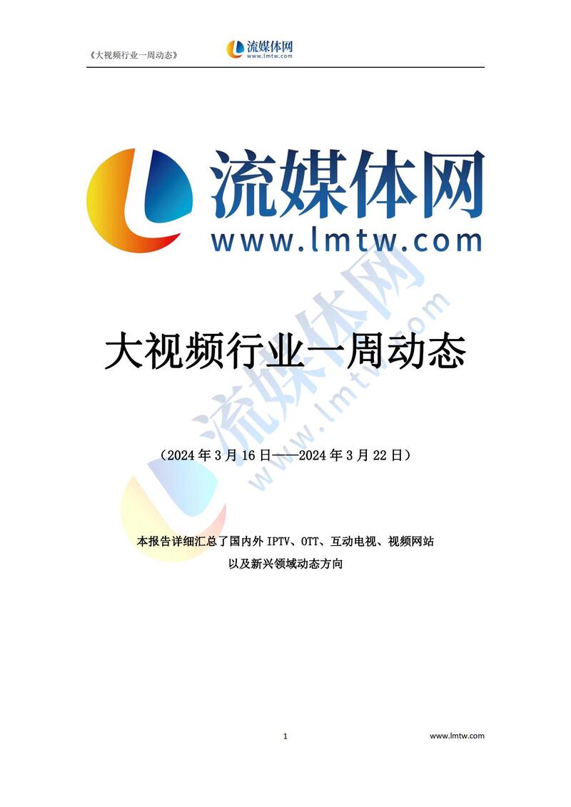 【流媒体网】摘要:本报告详细汇总了2024年3月16日—2024年3月22日国内外IPTV、OTT、互动电视、视频网站以及新兴领域动态方向,供业界参考!