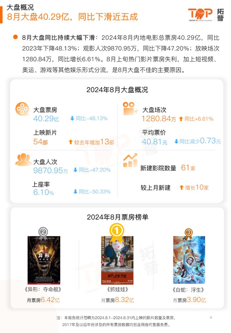 【流媒体网】摘要:2024年8月内地电影总票房40.29亿,同比2023年下降48.13%。(文末附有报告全文链接,欢迎今日流媒体VIP会员下载阅读!)