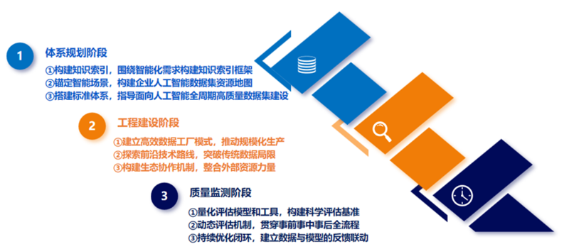 4. 高质量数据集建设“三步走”战略。首先,开展数据集体系规划,构建高质量数据集认知框架。其次,推动数据集工程建设,打造高质量数据集认知框架。最后,强化数据集质量检测,建立高质量数据集全流程管控机制。